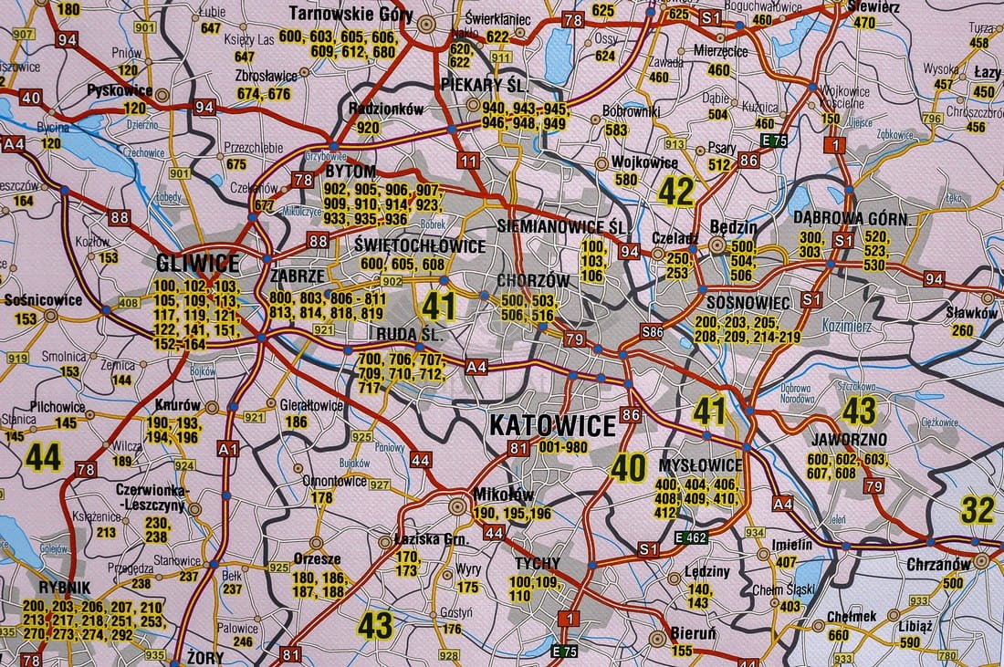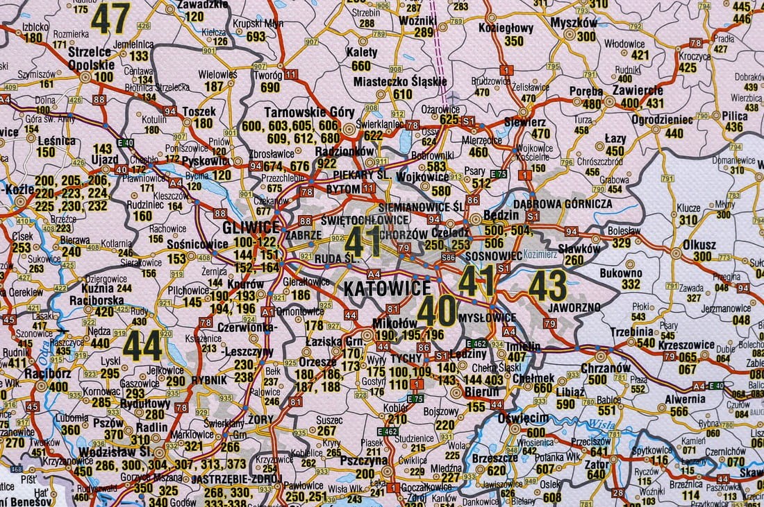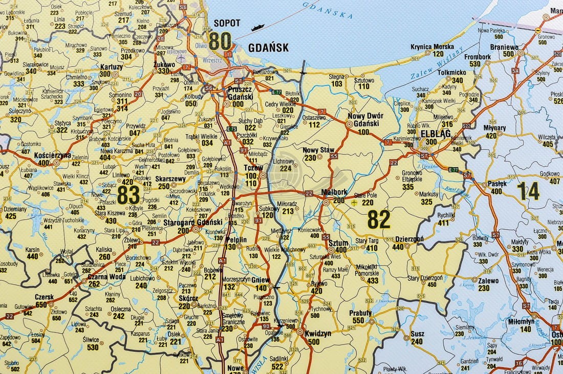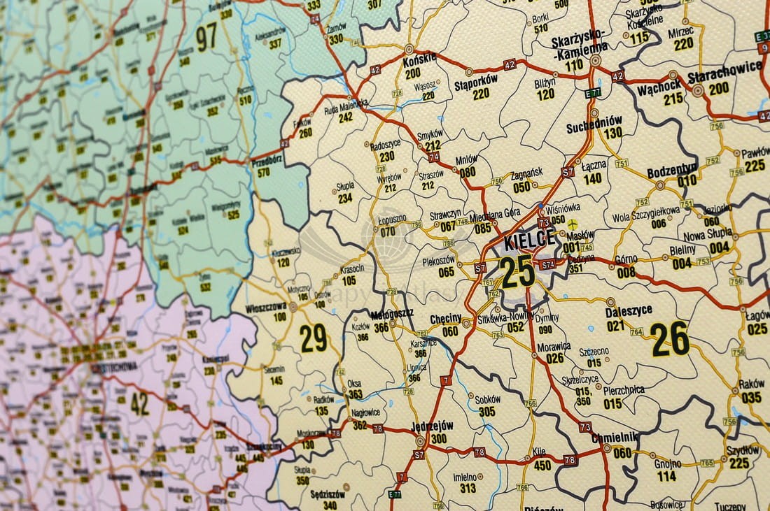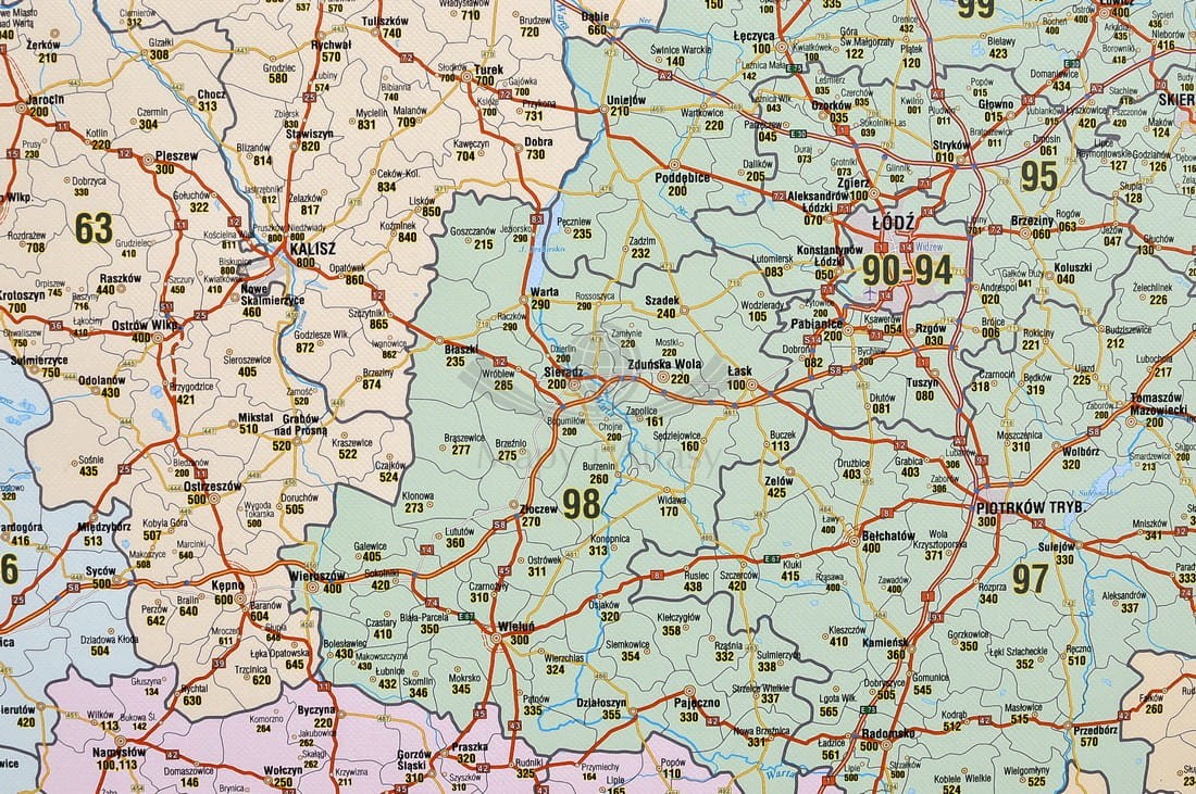 Obejmuje swym zasięgiem całą Polskę. Na bazie aktualnego przebiegu sieci drogowej pokazano kody pocztowe miejscowości. Kolorami zilustrowano okręgi pocztowe.