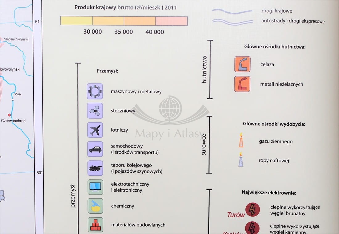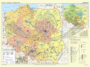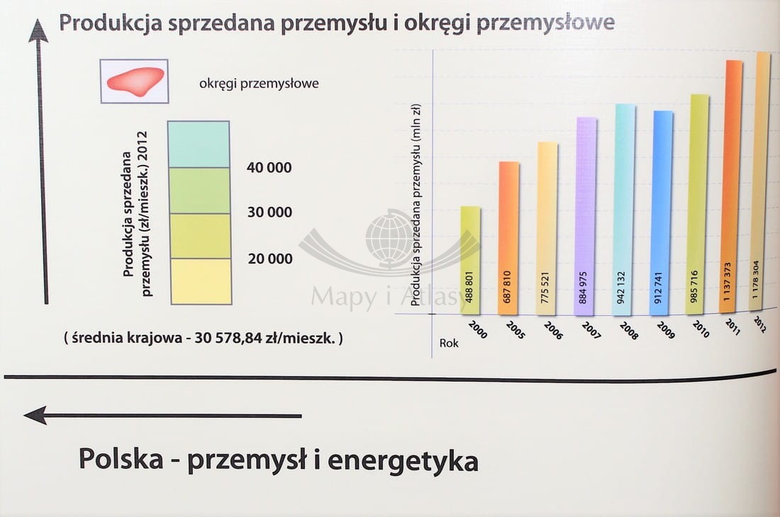 Szkolna mapa ścienna w skali 1:550 000 przedstawiająca nowoczesne ujęcie różnorodnych zagadnień z geografii gospodarczej Polski. Mapa główna, na podkładzie kartogramu PKB (zł/mieszk.), ukazuje rozmieszczenie głównych ośrodków poszczególnych gałęzi przemysłu. Dodatkowo powiązane jest to ze strukturą sieci energetycznej, czyli lokalizacjami najważniejszych elektrowni (z podziałem na rodzaje) oraz przebiegiem sieci najwyższych napięć.
