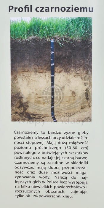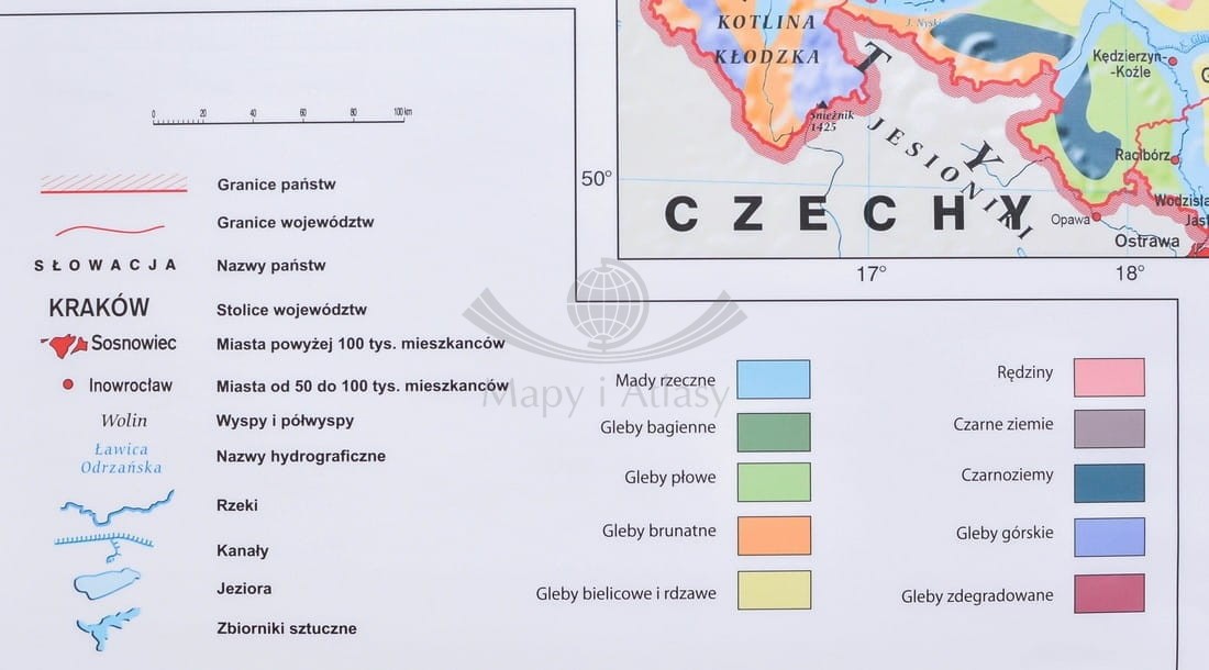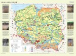 Szkolna mapa ścienna w skali 1:550 000 przedstawiająca rozmieszczenie najważniejszych typów gleb na obszarze Polski, zobrazowana została przykładami wybranych profili glebowych.