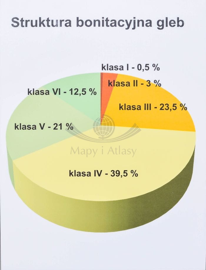 Na mapie pomocniczej ukazana jest struktura wielkościowa gospodarstw rolnych jako analiza dwóch czynników: średniej powierzchni gruntów rolnych w gospodarstwie i zróżnicowania gospodarstw rolnych wg grup obszarowych. Dodatkowych informacji dostarczają wykresy kołowe przedstawiające: strukturę bonitacyjną gleb, strukturę użytkowania ziemi i strukturę zasiewów.