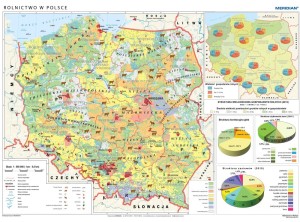 Mapa główna przedstawia rolnicze użytkowanie ziemi w Polsce, czyli przeważające uprawy na danym obszarze. Na tym tle ukazane jest rozmieszczenie istotnych rejonów hodowli zwierząt gospodarczych oraz uprawy ważnych ekonomicznie roślin takich jak rośliny oleiste, włókniste, chmiel czy tytoń.