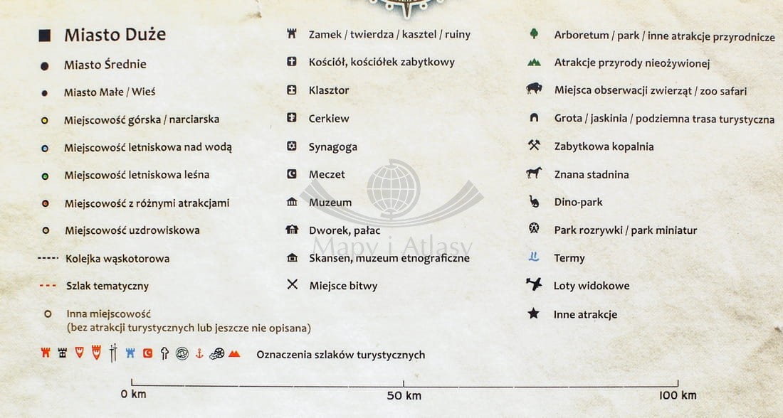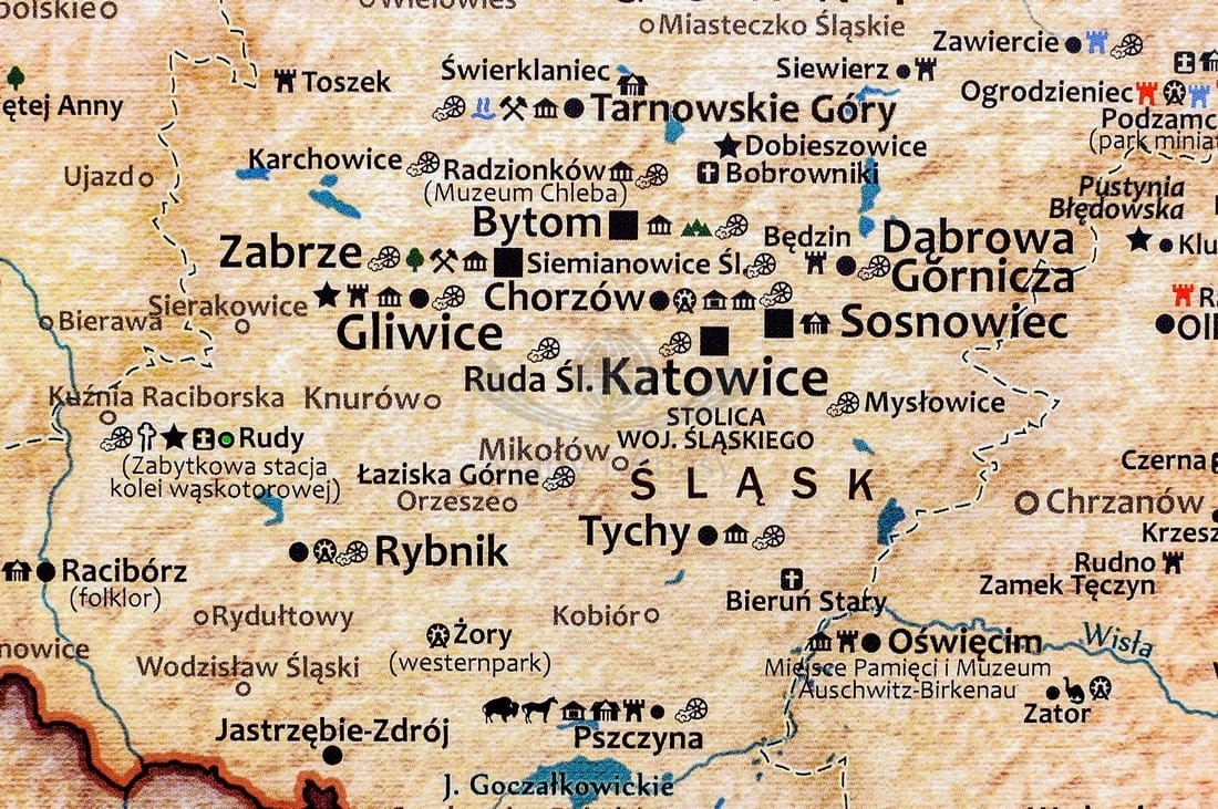 Turystyczna mapa ścienna Polski przedstawiająca atrakcyjne miejsca oraz te, które oferują rozrywkę, naukę lub przygodę. Ma przybliżyć również geografię naszego kraju, zapoznać z układem rzek, szlakami, położeniem miejsc historycznych.