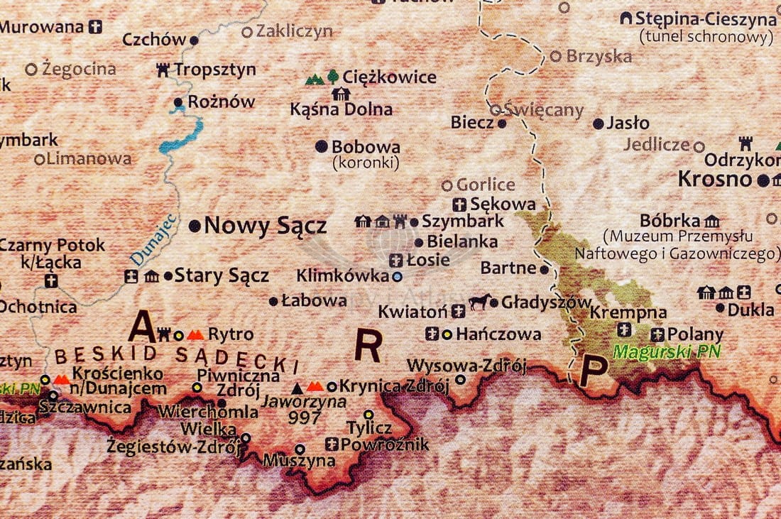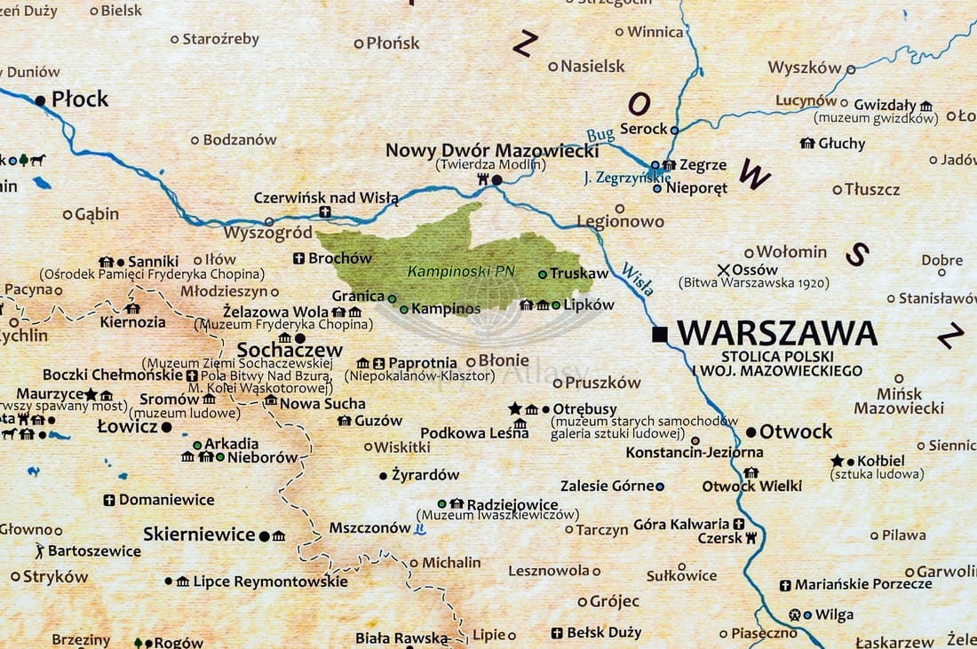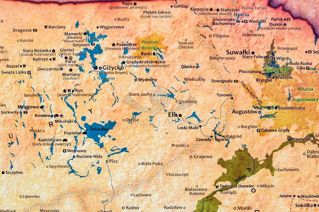 Turystyczna mapa ścienna Polski przedstawiająca atrakcyjne miejsca oraz te, które oferują rozrywkę, naukę lub przygodę. Mapa oprawiona w drewniane półwałki z zawieszką sznurkową (mapa gotowa do powieszenia).
