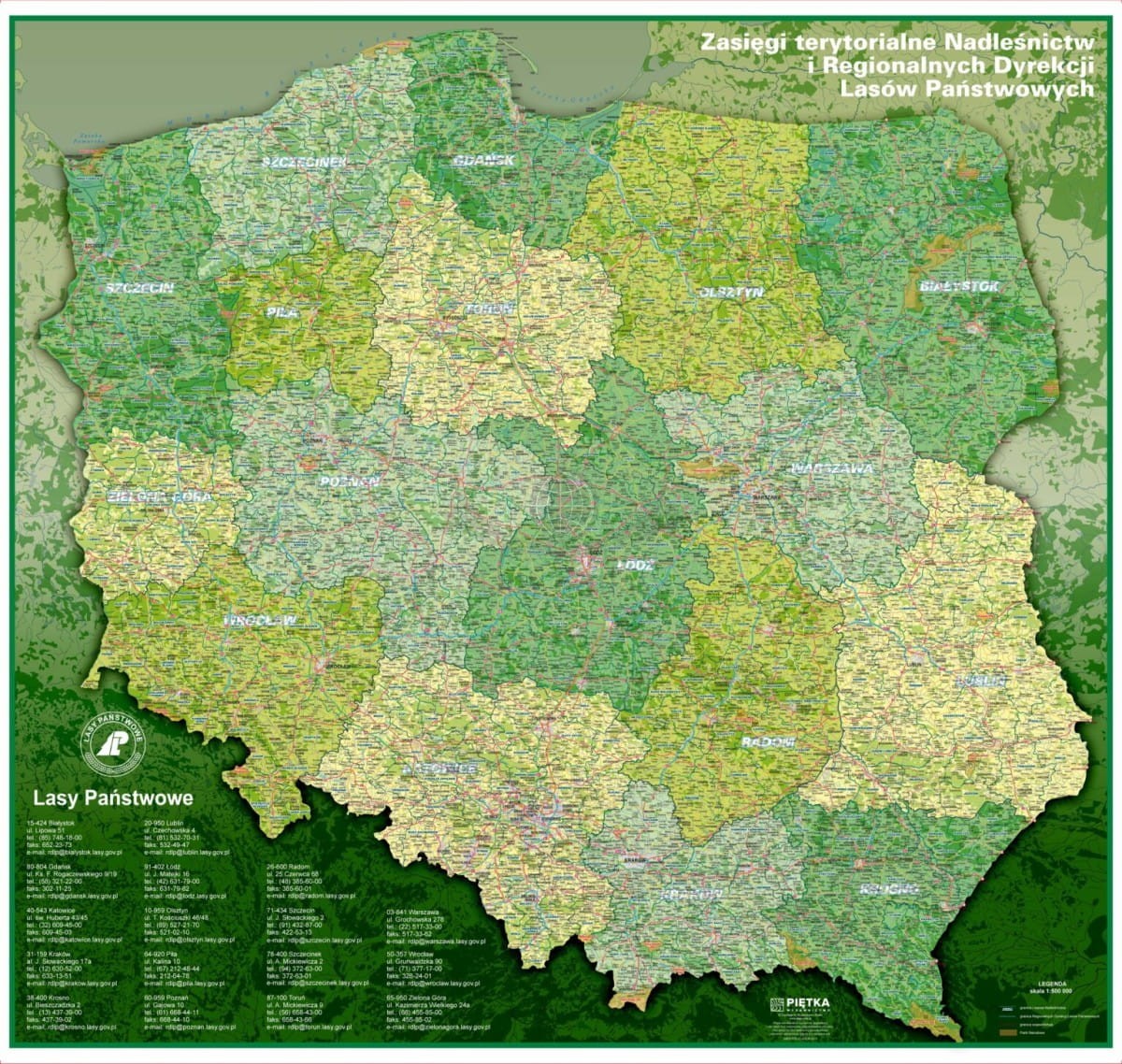 Ścienna mapa „Zasięgi terytorialne Nadleśnictw i Regionalnych Dyrekcji Lasów Państwowych” w skali 1: 500 000 wydawnictwa Piętka.