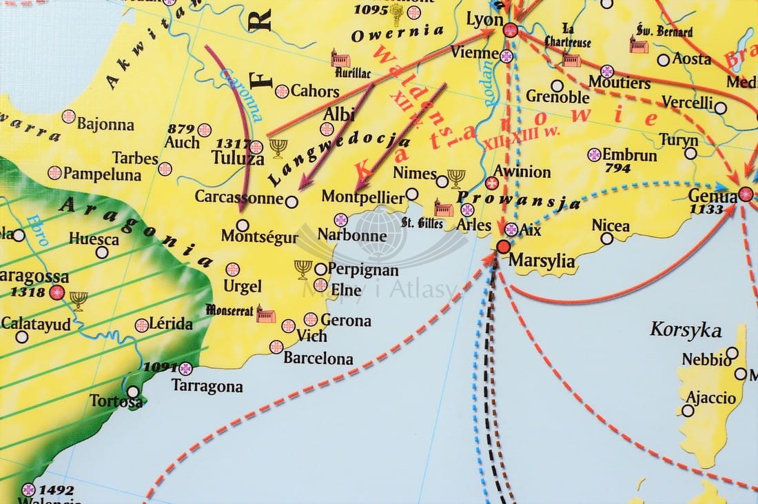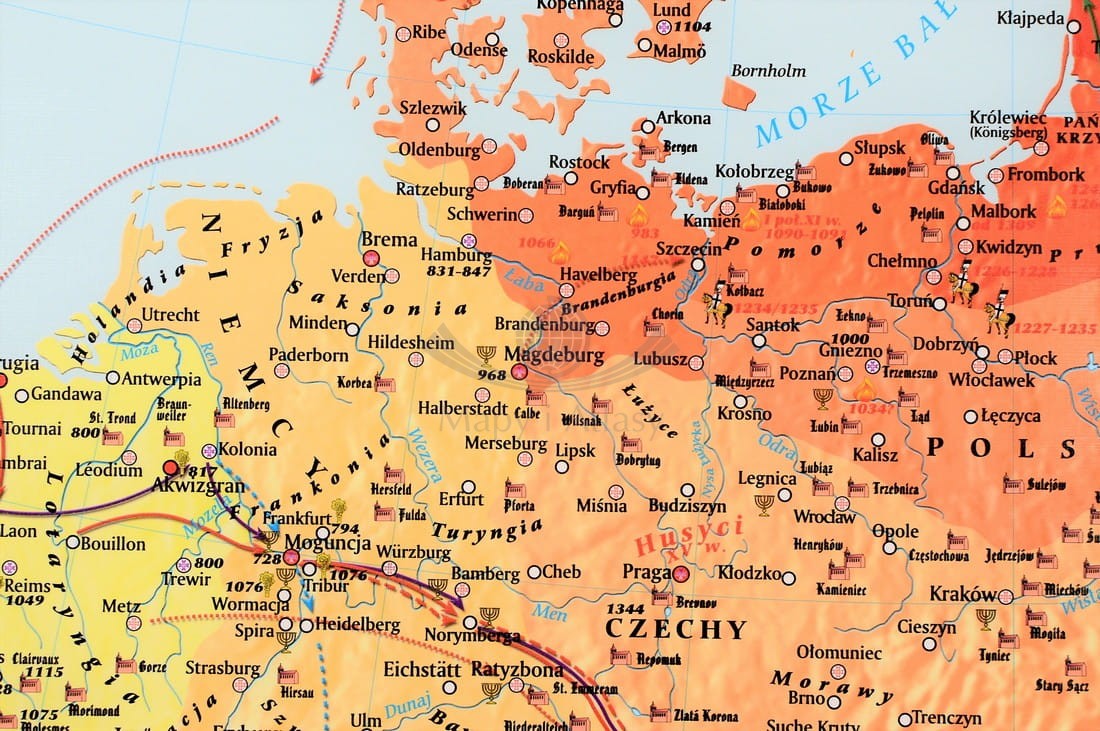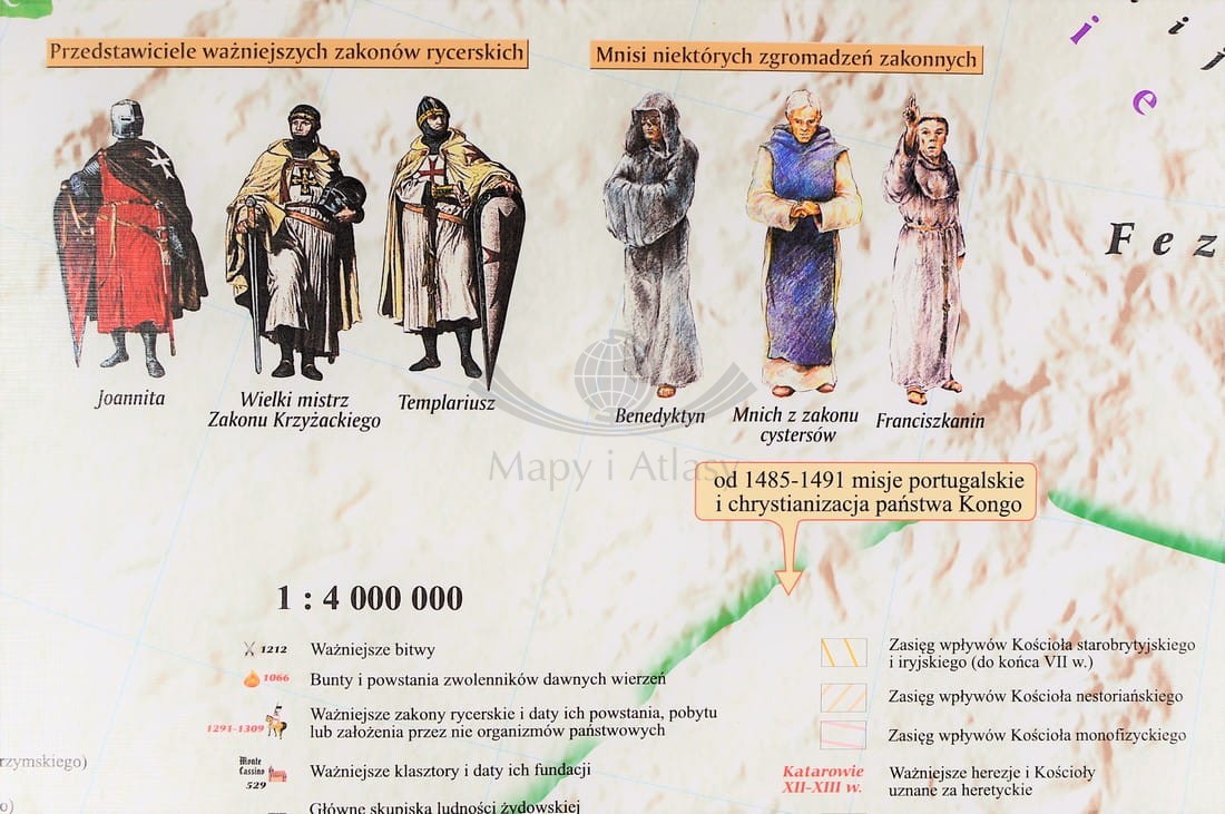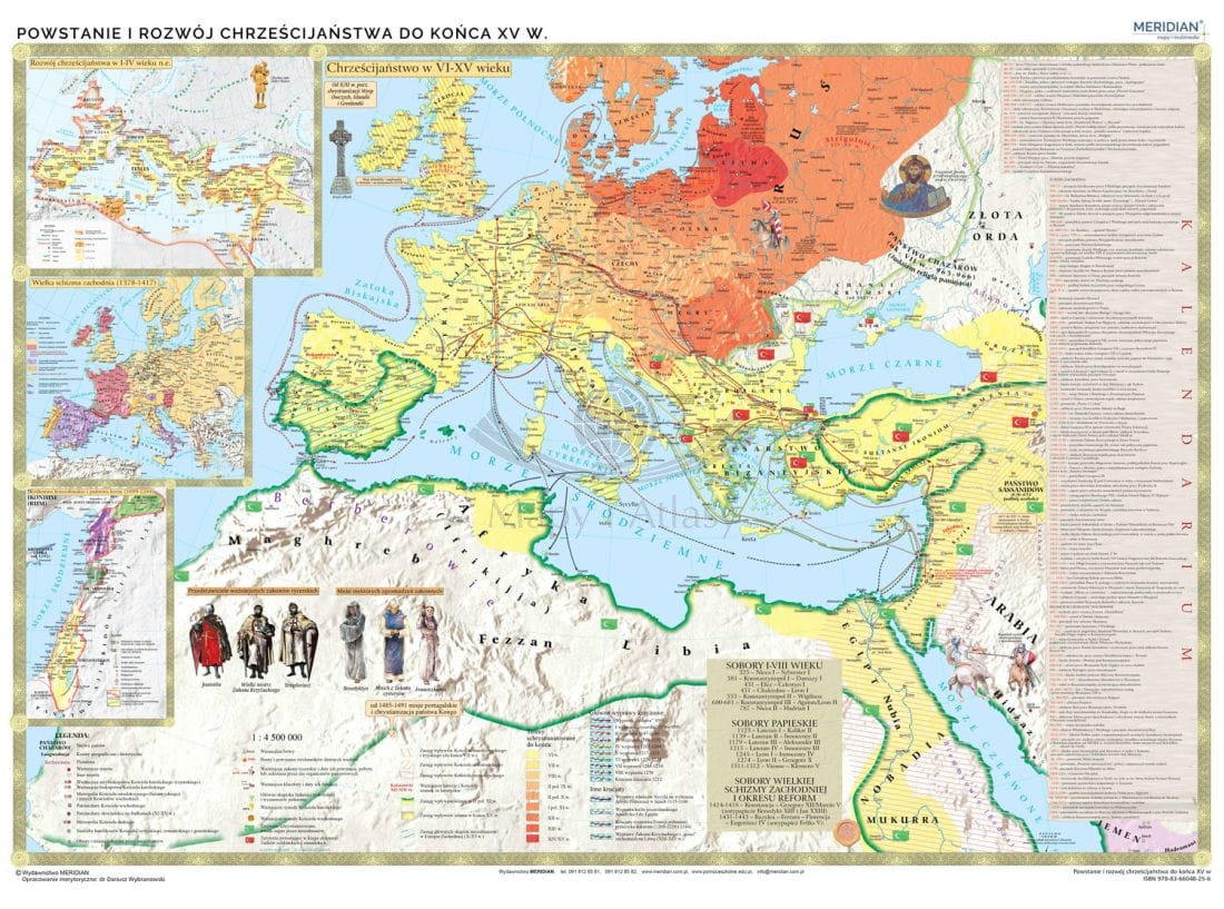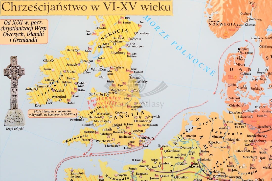 Ścienna mapa szkolna w skali 1:4 500 000 prezentująca półtora tysiąca lat historii chrześcijaństwa. Od południowej Norwegii na północy, po pogranicze Sudanu i Etiopii na południu. Od Atlantyku po krańce Rusi i góry Kaukazu...
