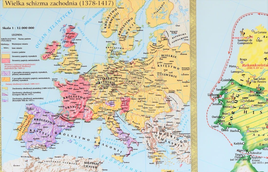 - Wielka schizma zachodnia (1378-1417) pokazującą katastrofalny rozłam w kościele, który na kilkadziesiąt lat podzielił chrześcijański Zachód.