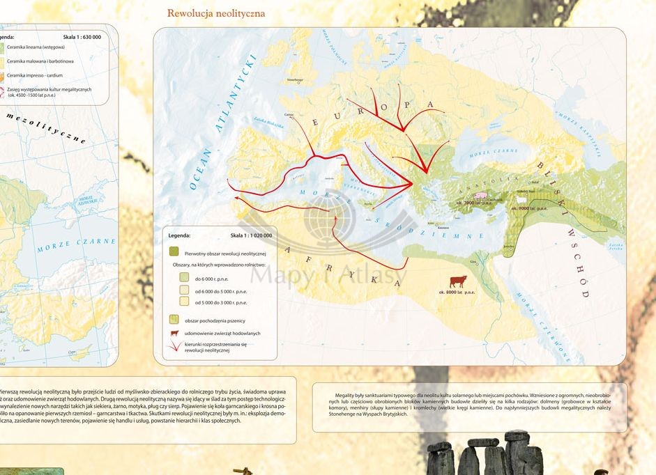 Szkolna mapa ścienna przedstawiająca przełomowe zdobycze pierwszej i drugiej rewolucji neolitycznej. Narodziny rolnictwa, udomowienie zwierząt, osiadły tryb życia oraz opanowanie pierwszych rzemiosł...
