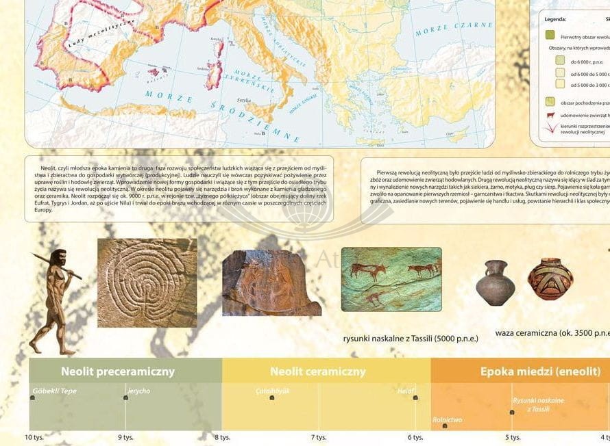 Szkolna mapa ścienna przedstawiająca przełomowe zdobycze pierwszej i drugiej rewolucji neolitycznej. Narodziny rolnictwa, udomowienie zwierząt, osiadły tryb życia oraz opanowanie pierwszych rzemiosł doprowadziły do eksplozji demograficznej, powstania hierarchicznych społeczności, a później państw.