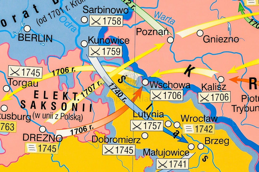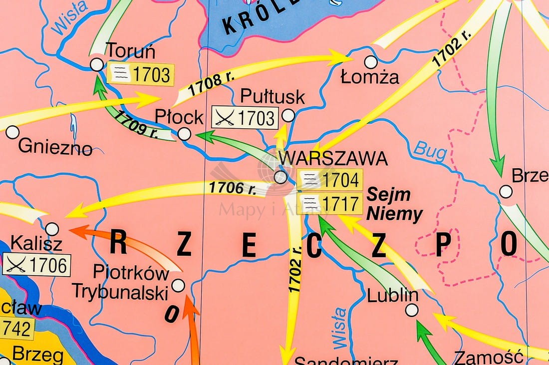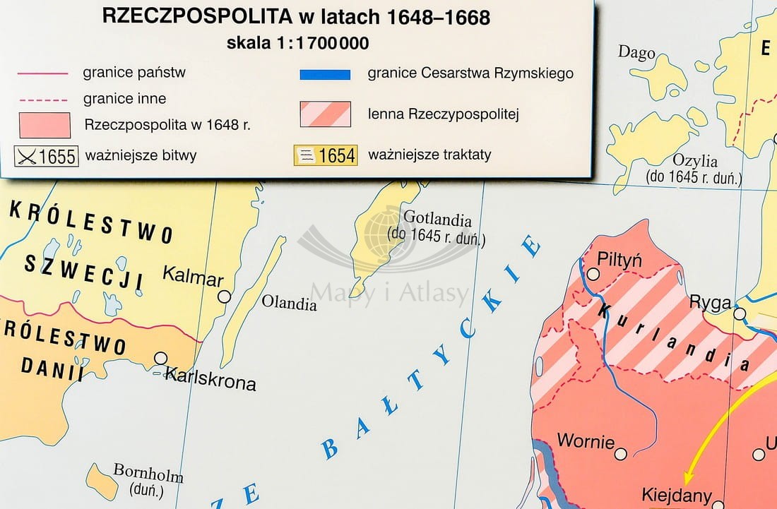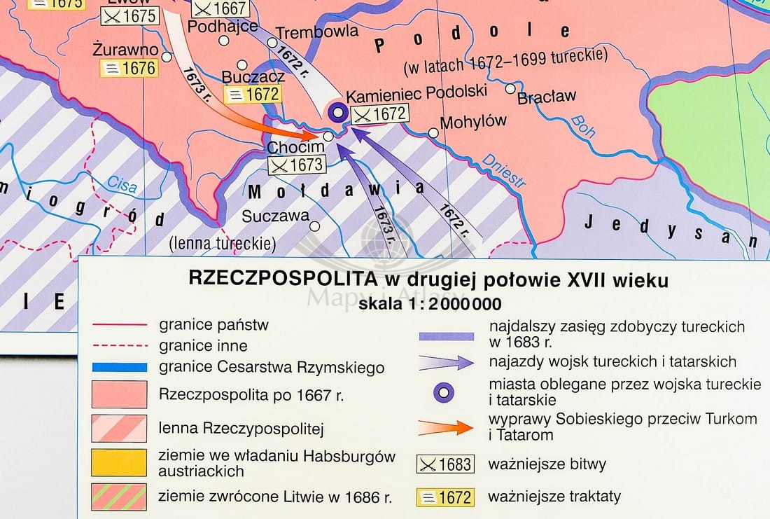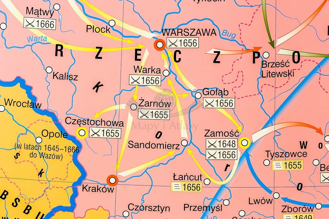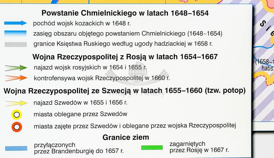 Pierwsza strona zawiera mapę główną przedstawiającą Rzeczpospolitą podczas panowania Jana Kazimierza ze szczególnym uwzględnieniem wojen z Kozakami, Szwecją i Rosją, w skali 1:1 700 000 oraz mapę prezentującą Polskę w czasach Jana Sobieskiego...
