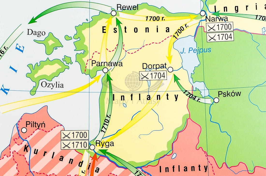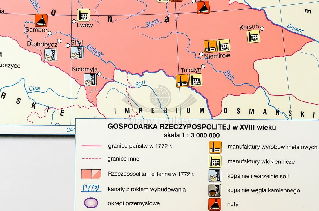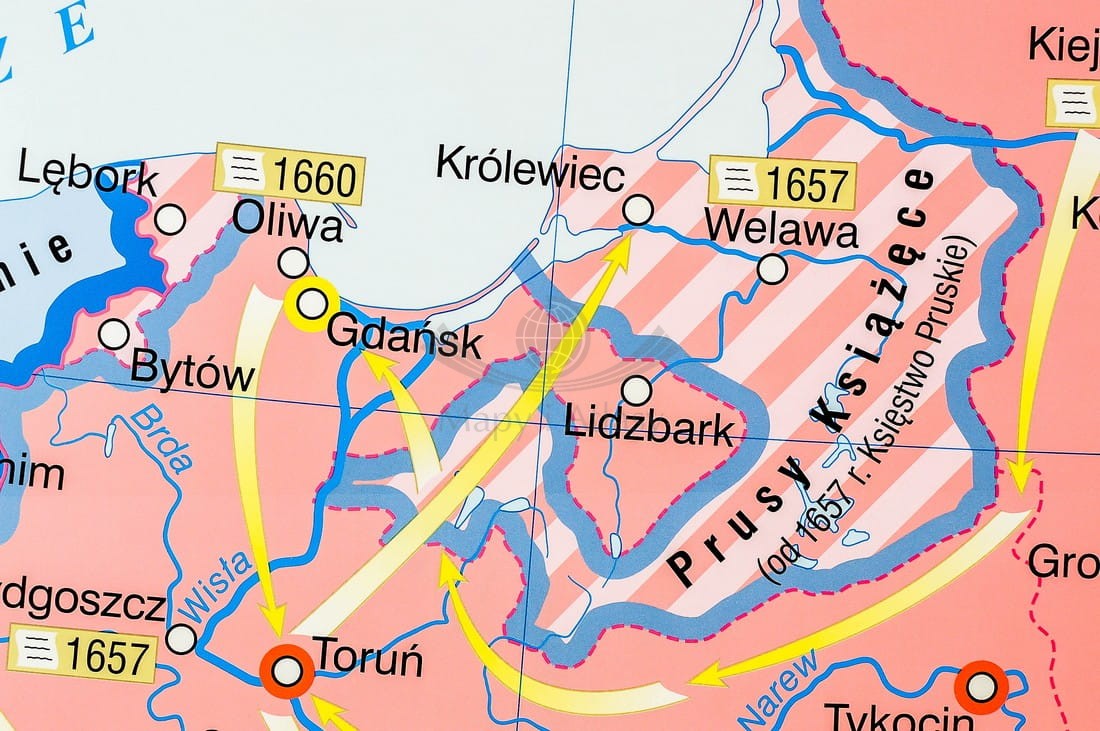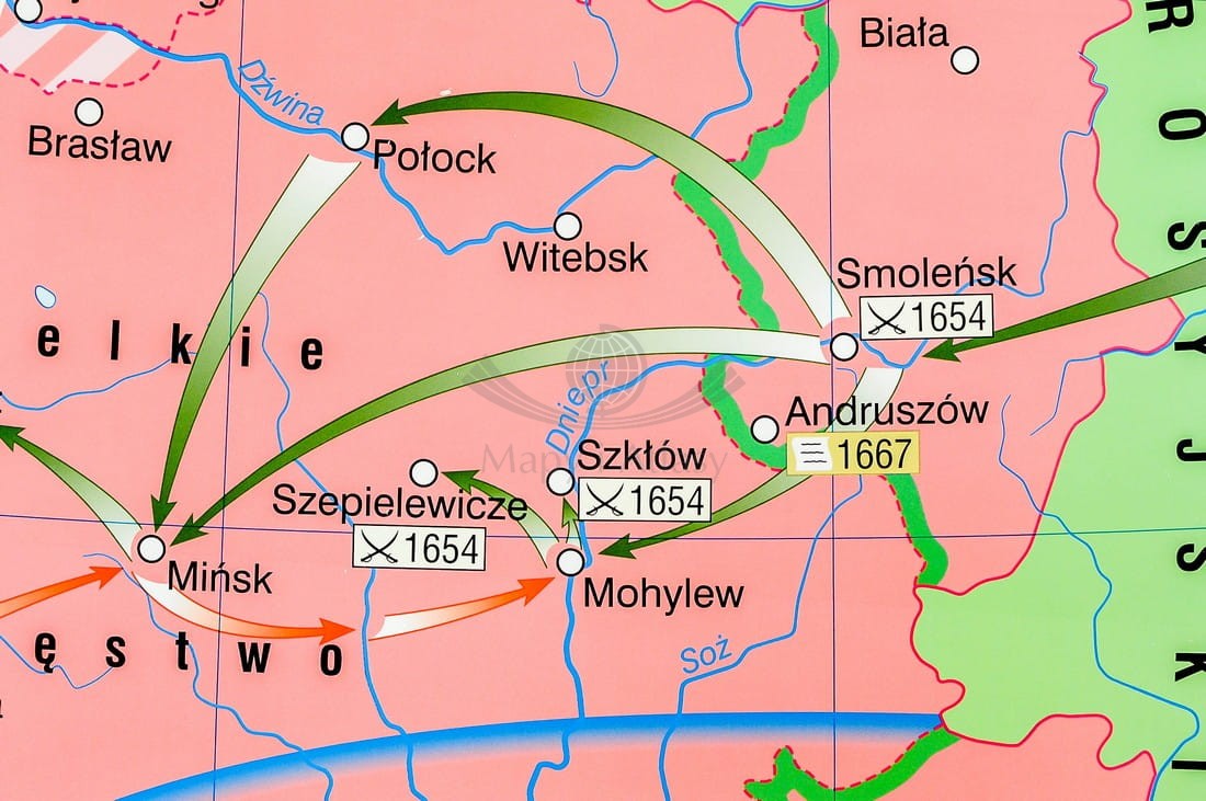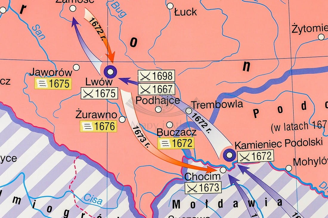 Pierwsza strona zawiera mapę główną przedstawiającą Rzeczpospolitą podczas panowania Jana Kazimierza ze szczególnym uwzględnieniem wojen z Kozakami, Szwecją i Rosją, w skali 1:1 700 000 oraz mapę prezentującą Polskę w czasach Jana Sobieskiego...