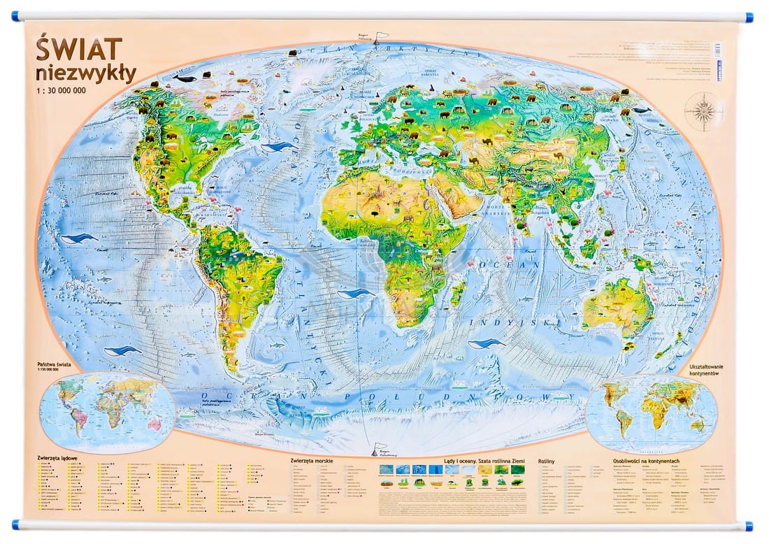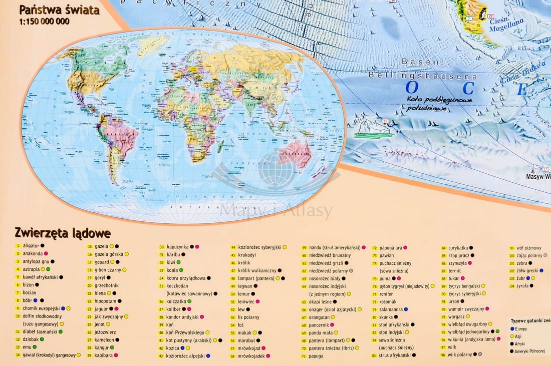 -mapę polityczną i fizyczną świata w skali 1:150 000 000,