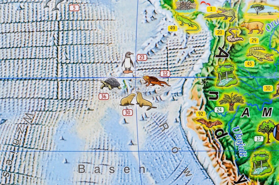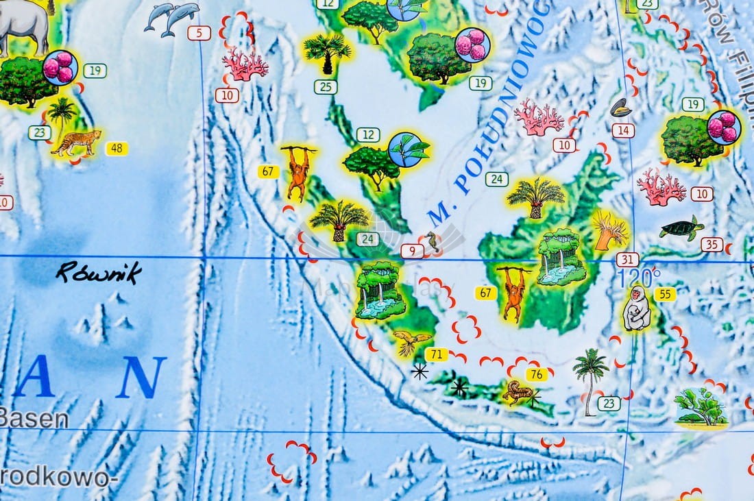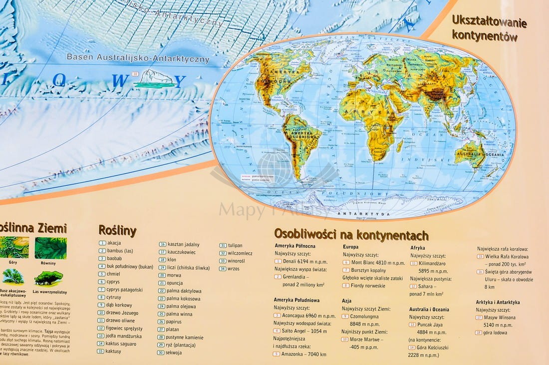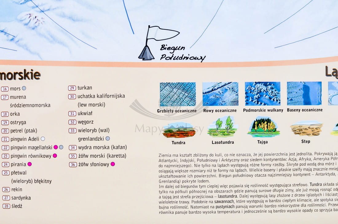 Zobaczą, że Ziemia nie jest wielką równiną – ani na lądach, ani – tym bardziej – na oceanach, które mają jeszcze bardziej urozmaiconą rzeźbę terenu. Odkryją, że lądy bardzo się od siebie różnią, gdyż jedne porastają wielkie wilgotne lasy równikowe, inne są suchymi gorącymi pustyniami albo pustyniami… lodowymi, a zupełnie inne krajobrazy tworzą wysokie góry. Dzięki kolorowym rysunkom – poznają rozmieszczenie niektórych formacji roślinnych i gatunków roślin oraz charakterystycznych dla różnych kontynentów i oceanów zwierząt. Do tego dochodzą jeszcze osobliwości takie jak: najwyższe szczyty, charakterystyczne wielkie monolity skalne, wodospady i inne. Z tą mapą, kształtowanie wiedzy małego odbiorcy o świecie przyrody nieożywionej i ożywionej stanie się fascynujące.