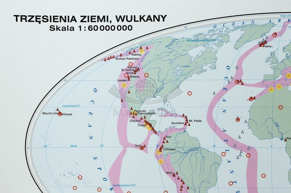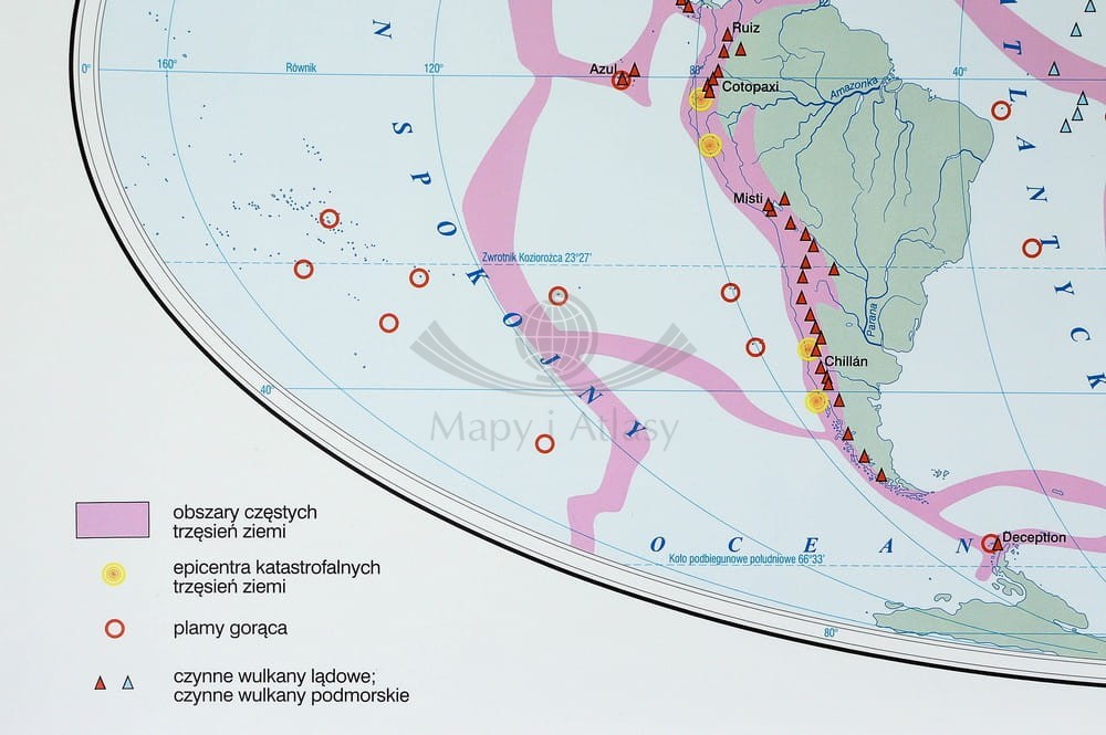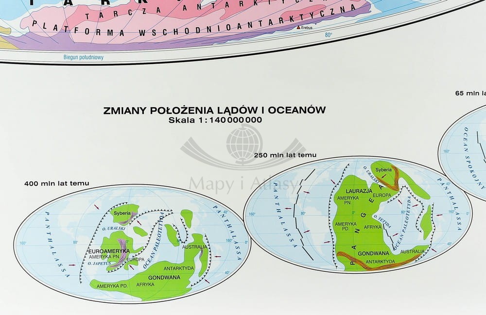 Na pierwszej stronie mapa główna "Świat - budowa geologiczna" w skali 1:24000 000, z mapą uzupełniającą "Trzęsienia ziemi, wulkany" w skali 1:60 000 000 oraz dodatkowymi czterema mapami w skali 1:140 000 000 "Rozmieszczenie lądów i oceanów"...