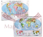 Na pierwszej stronie mapa główna "Świat - budowa geologiczna" w skali 1:24000 000, z mapą uzupełniającą "Trzęsienia ziemi, wulkany" w skali 1:60 000 000 oraz dodatkowymi czterema mapami w skali 1:140 000 000 "Rozmieszczenie lądów i oceanów".