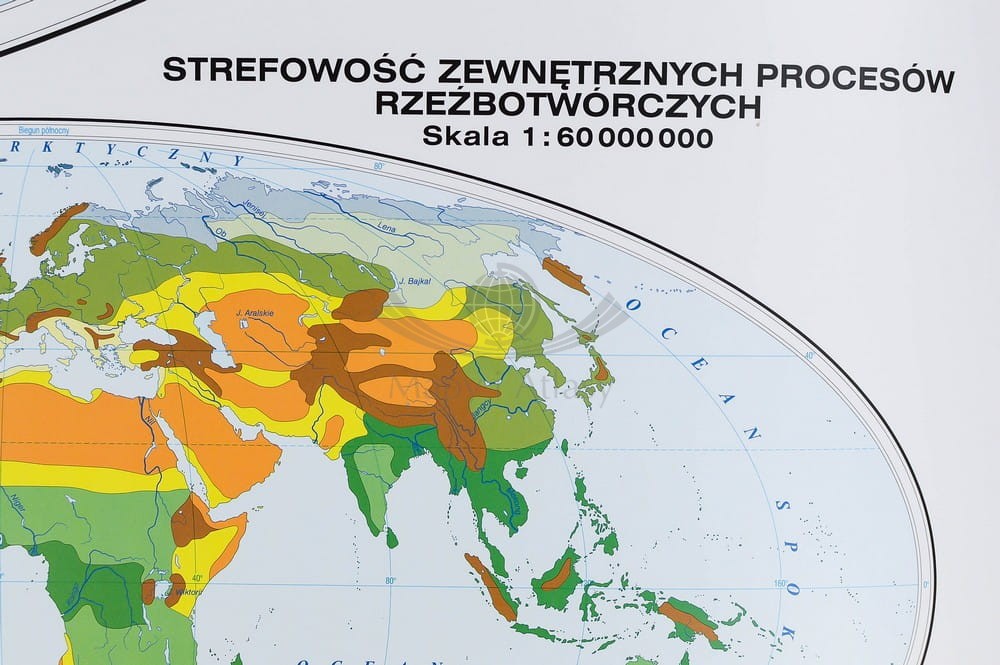 Druga strona zawiera mapę główną "Świat - wielkie formy ukształtowania powierzchni" w skali 1:24 000 000, z uzupełniającymi dwiema mapami w skalach 1:60 000 000 "Zróżnicowane nasilenie procesów wewnętrznych" oraz "Strefowość zewnętrznych procesów rzeźbotwórczych".