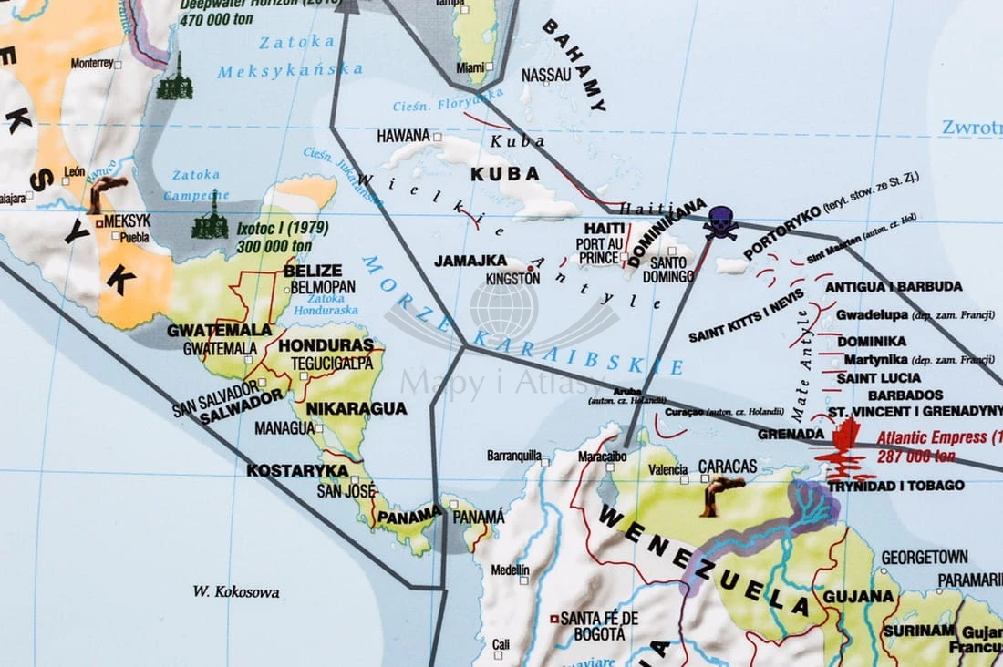 Ścienna mapa szkolna świata w skali 1:22 000 000 przedstawiająca problematykę wielostronnej degradacji biosfery spowodowanej działalnością człowieka. Dotyczy to zarówno zanieczyszczania atmosfery, hydrosfery...