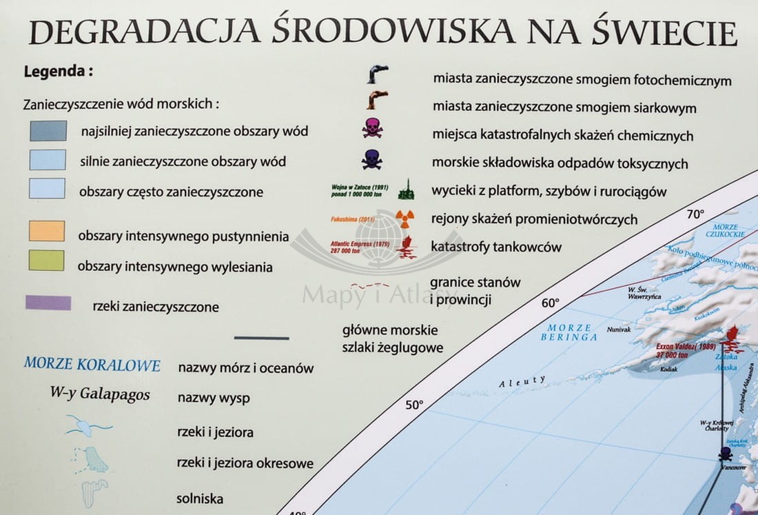 Ścienna mapa szkolna świata w skali 1:22 000 000 przedstawiająca problematykę wielostronnej degradacji biosfery spowodowanej działalnością człowieka. Dotyczy to zarówno zanieczyszczania atmosfery, hydrosfery jak i pustynnienia oraz wylesiania obszarów lądowych. Zaznaczone są także miasta o największym zanieczyszczeniu smogiem.