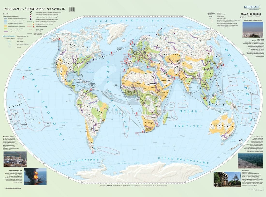 Ścienna mapa szkolna świata w skali 1:26 000 000 przedstawiająca problematykę wielostronnej degradacji biosfery spowodowanej działalnością człowieka. Dotyczy to zarówno zanieczyszczania atmosfery, hydrosfery jak i pustynnienia oraz wylesiania obszarów lądowych. Zaznaczone są także miasta o największym zanieczyszczeniu smogiem.