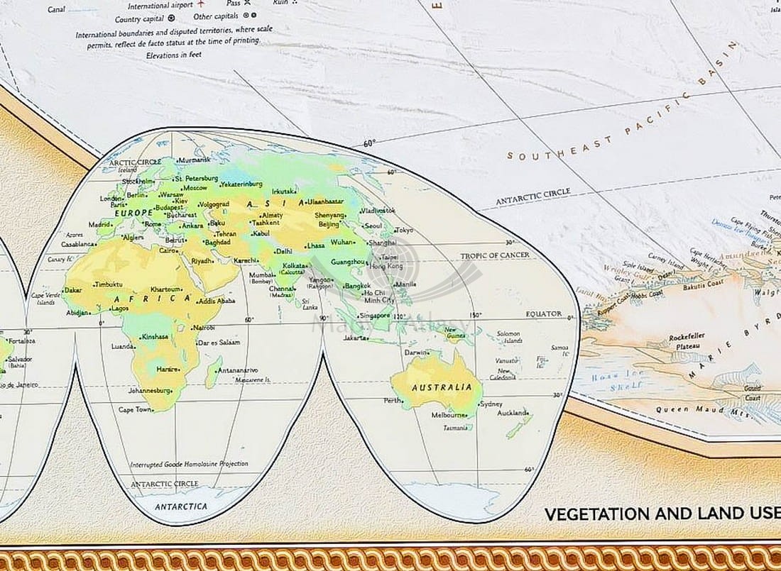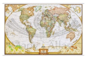 Ekskluzywna ścienna mapa świata w skali 1:29 772 000 z elementami mapy fizycznej, drogowej i administracyjnej. Stylizacja charakterystyczna dla National Geographic. Wersja matowa.