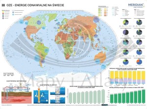 Ścienna mapa szkolna przedstawiająca przekrojowo zagadnienia produkcji energii ze źródeł odnawialnych na świecie. Ostatnie dziesięciolecia cechuje systematyczny wzrost udziału energii z odnawialnych źródeł w globalnej produkcji. Rośnie też grupa krajów, których zapotrzebowanie energetyczne jest większości lub całkowicie zaspokajane z OZE.