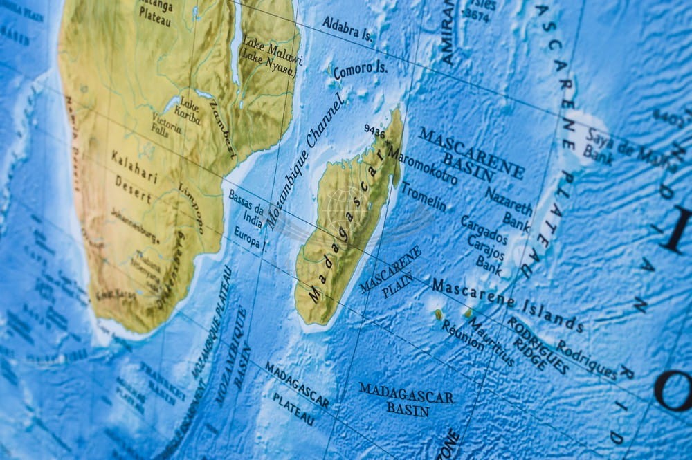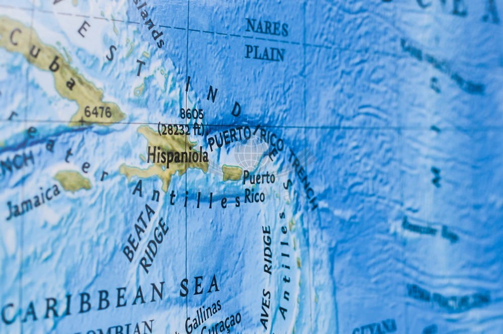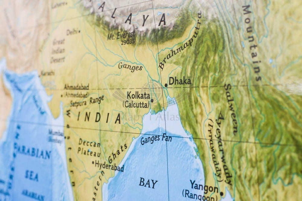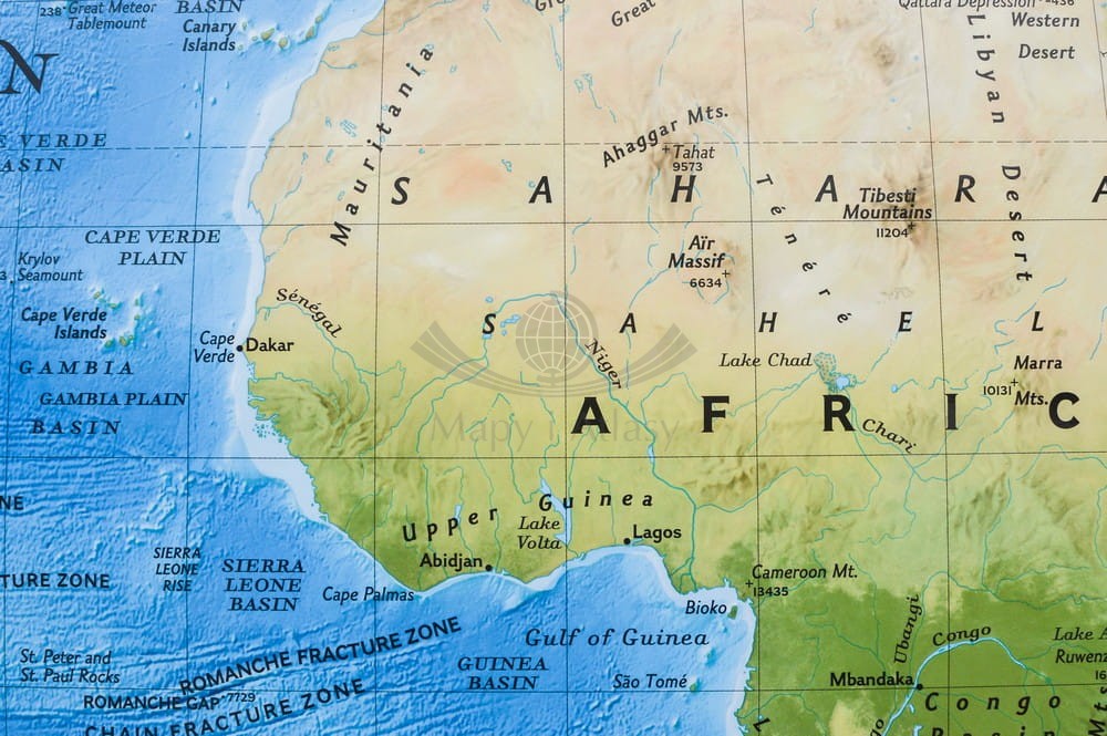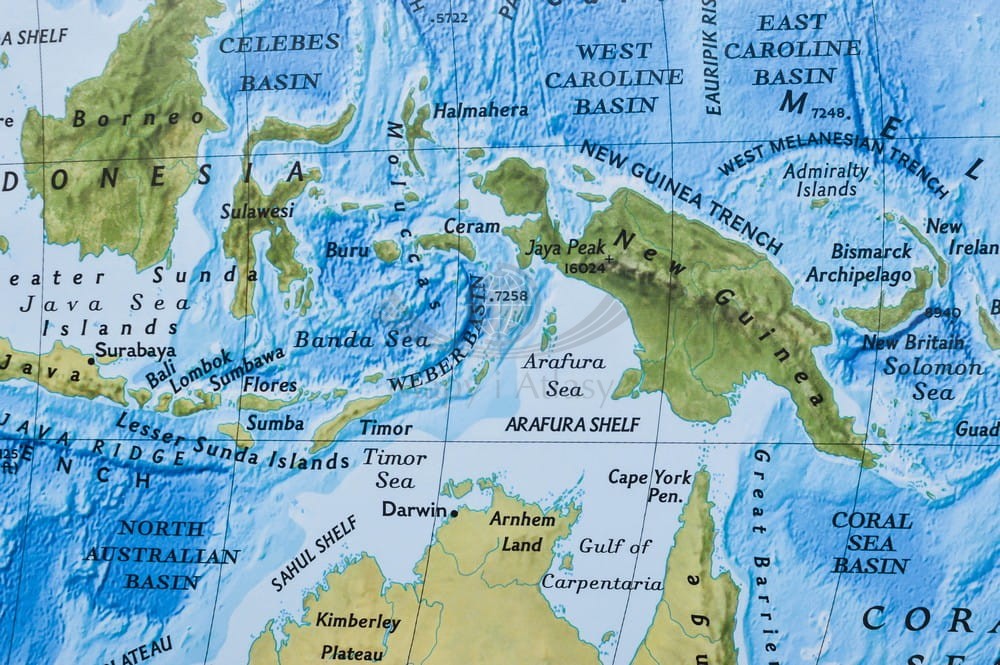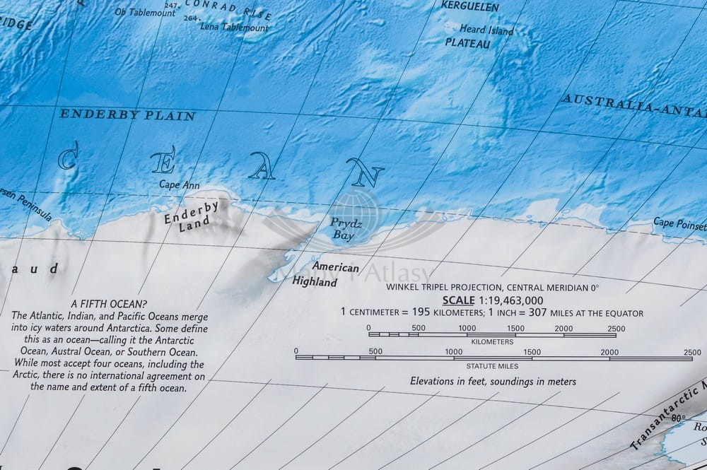 Ścienna mapa fizyczna świata w skali 1:35 842 000 wydawnictwa National Geographic. Na mapie pokazano w plastyczny sposób relief dna oceanów.