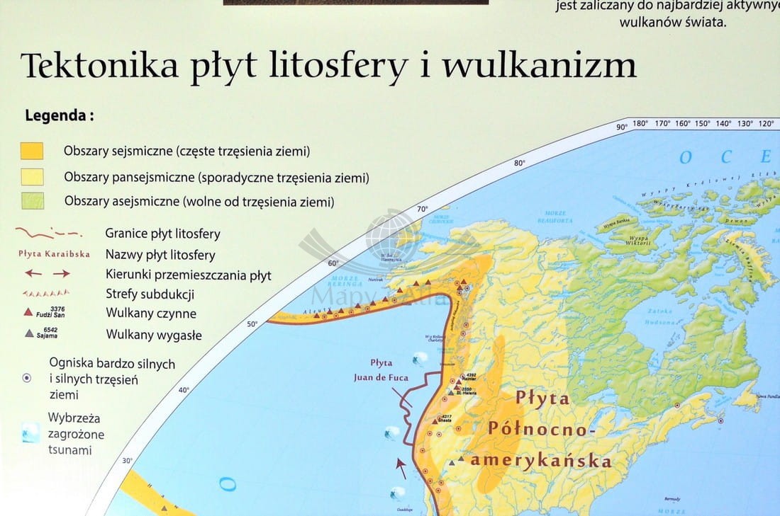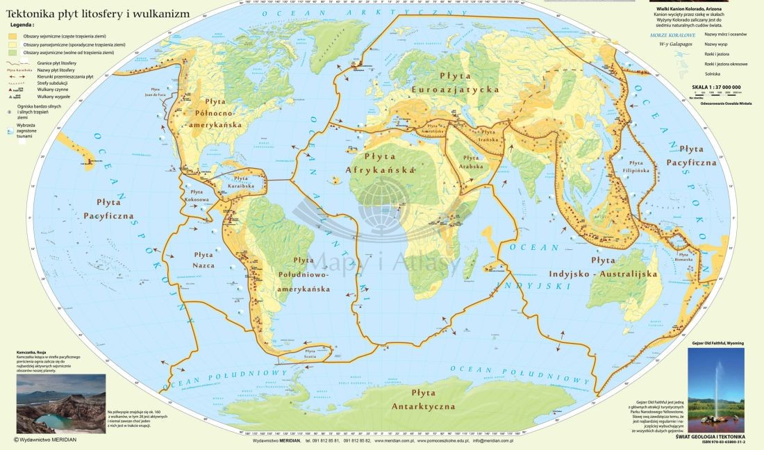 Ścienna, dwudzielna mapa szkolna syntetycznie i czytelnie przedstawiająca podstawowe zagadnienia z geologii i tektoniki płyt litosfery oraz wulkanizmu naszej planety.