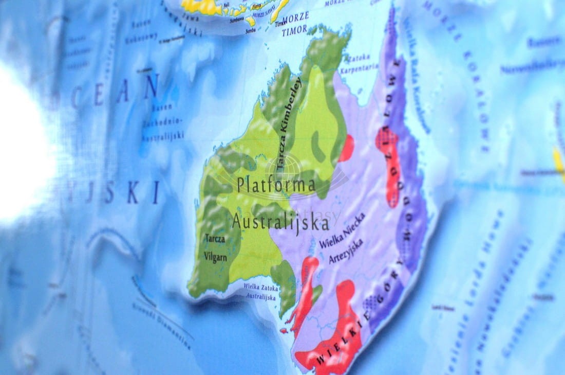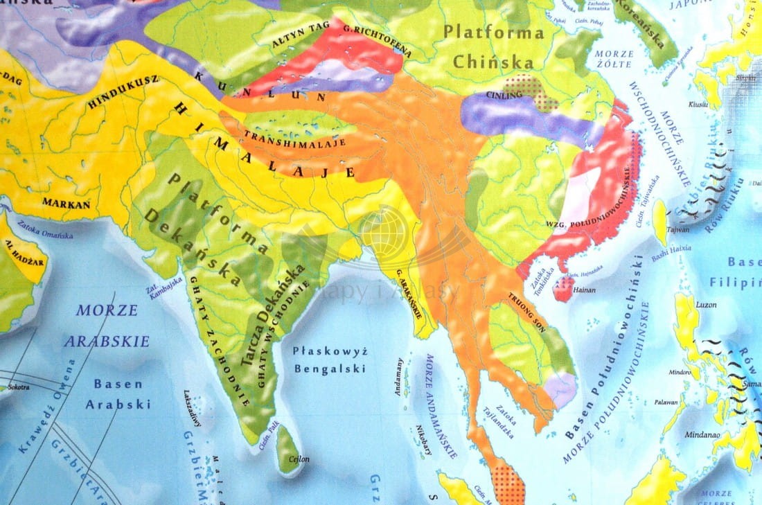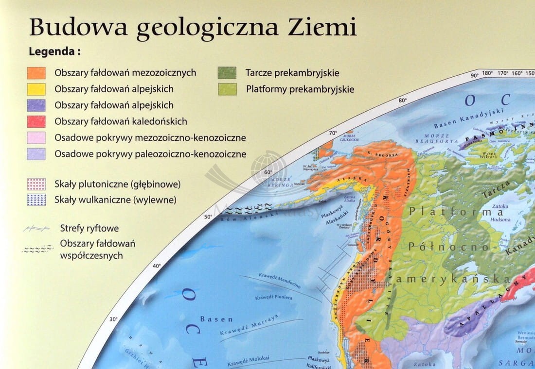 Ścienna, dwudzielna mapa szkolna w skali 1:37 000 000 syntetycznie i czytelnie przedstawiająca podstawowe zagadnienia z geologii i tektoniki płyt litosfery oraz wulkanizmu naszej planety.