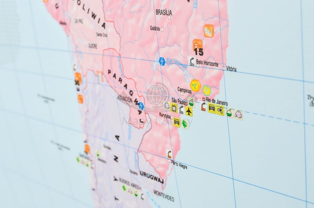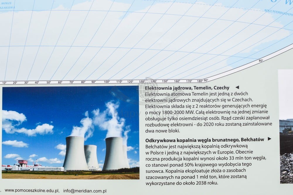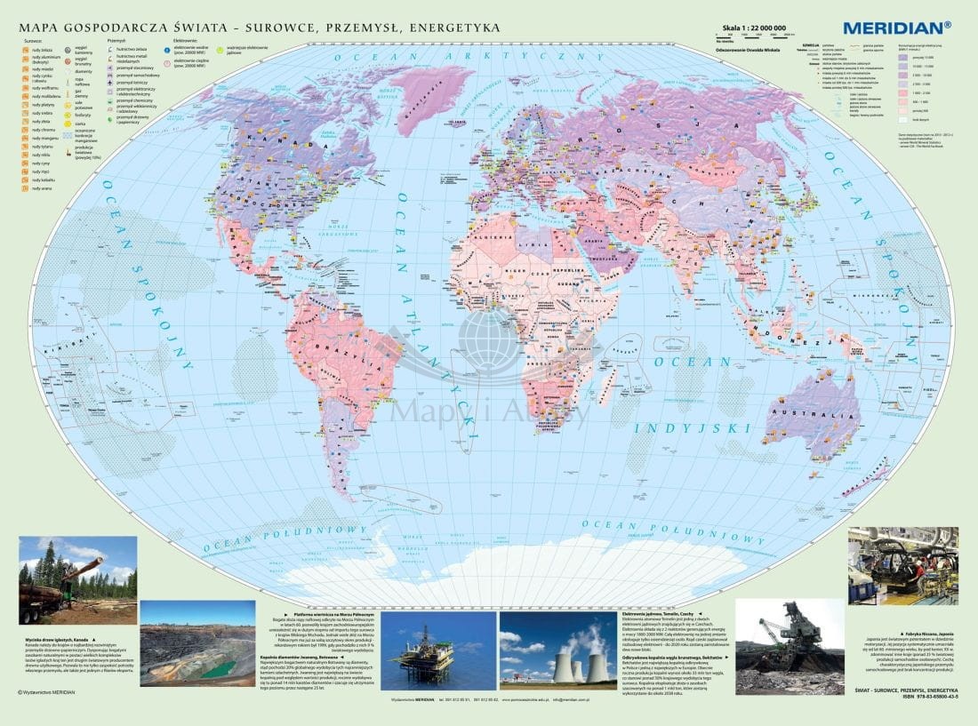 Czytelne sygnatury ułatwiają korzystanie z mapy, a główni producenci opisani są wartościami procentowego udziału w produkcji światowej. Mapa została wzbogacona dodatkowo o zdjęcia ilustrujące przykładowe zagadnienia.