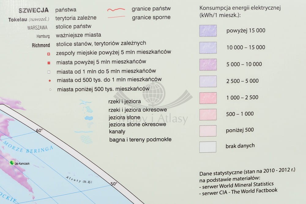 Szkolna mapa ścienna w skali 1:22 000 000 przedstawiająca zróżnicowanie gospodarcze świata - na podkładzie kartogramu konsumpcji energii elektrycznej ukazane jest rozmieszczenie i wydobycie najważniejszych surowców naturalnych, główne ośrodki poszczególnych gałęzi przemysłu oraz lokalizacje największych elektrowni różnych typów.
