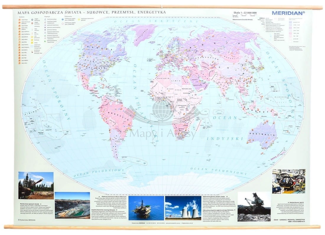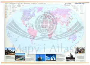 Świat 1:22 000 000. Mapa ścienna gospodarcza: surowce, przemysł, energetyka. Drewniane półwałki