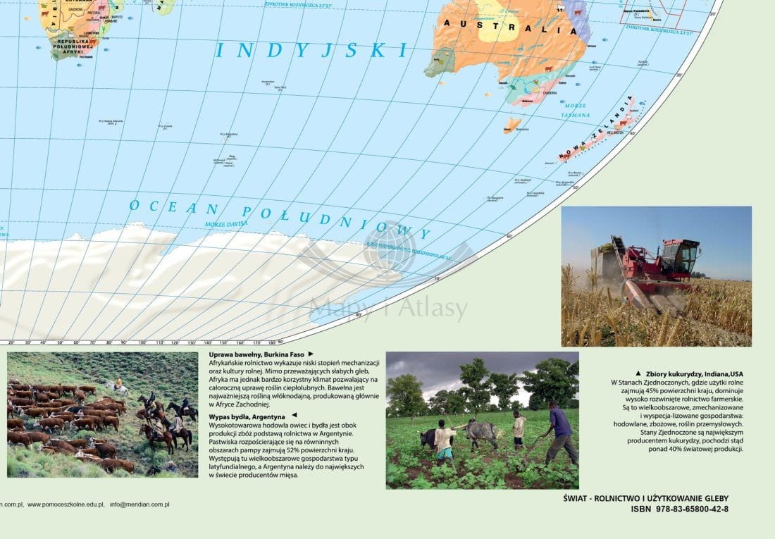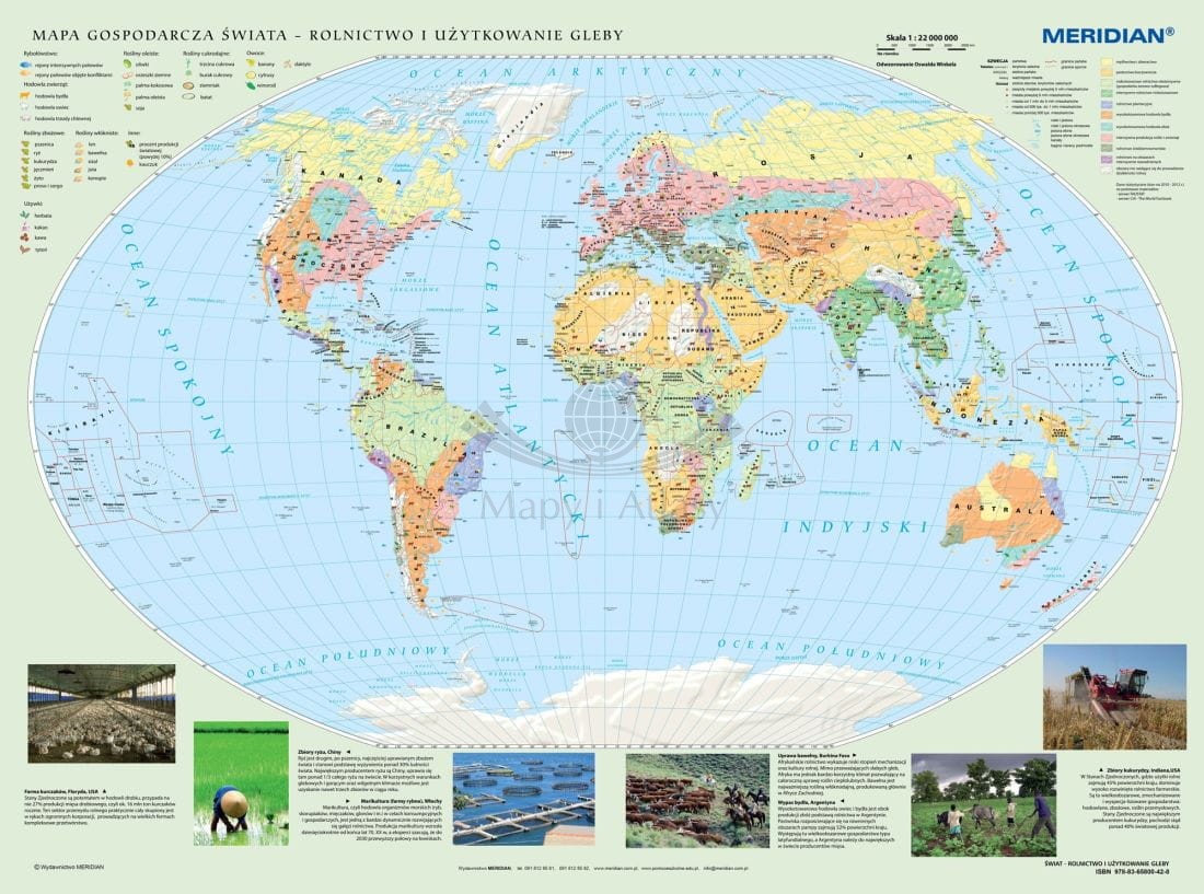Szkolna, gospodarcza mapa tematyczna w skali 1:22 000 000 przedstawiająca strukturę użytkowania ziemi na świecie. Na tym tle sygnaturami ukazane jest rozmieszczenie upraw istotnych ekonomicznie roślin, hodowli zwierząt gospodarczych oraz rybołówstwa. Główni producenci opisani są wartościami procentowego udziału w produkcji światowej.