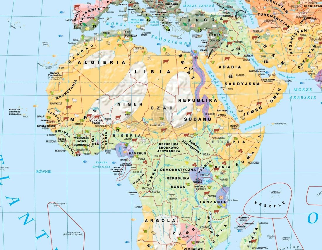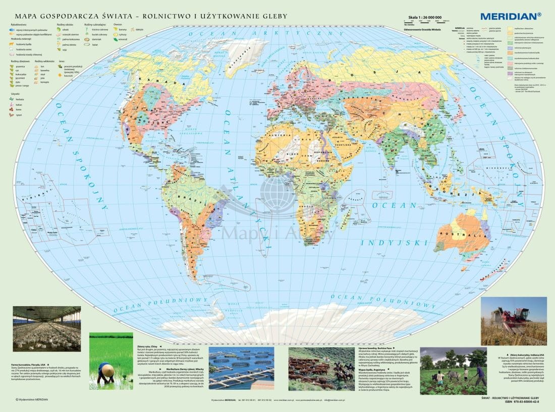 Szkolna, gospodarcza mapa tematyczna w skali 1:26 000 000 przedstawiająca strukturę użytkowania ziemi na świecie. Na tym tle sygnaturami ukazane jest rozmieszczenie upraw istotnych ekonomicznie roślin, hodowli zwierząt gospodarczych oraz rybołówstwa...