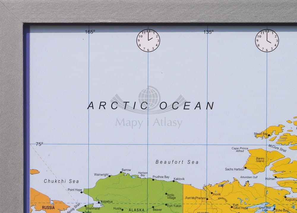 Rama drewniana, srebrna. Podkład z prawdziwego portugalskiego korka, umożliwia wbijanie szpilek. Zestaw chorągiewek (12 sztuk) do wpinania i wkręty do zawieszenia mapy dołączone do kompletu...