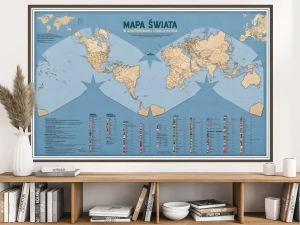 Ramka, którą widzisz na obrazkach jest częścią projektu mapy i jest na wydruku. Jest wydrukowana, ale zaprojektowana tak, żeby symulować prawdziwą. Dzięki temu, wystarczy przykleić mapę do ściany (najlepiej przy pomocy Tesa Powerstrip Poster – wtedy nie zniszczymy farby zdejmując lub poprawiając mapę) i już jest gotowa atrakcyjna i wartościowa ozdoba ściany.