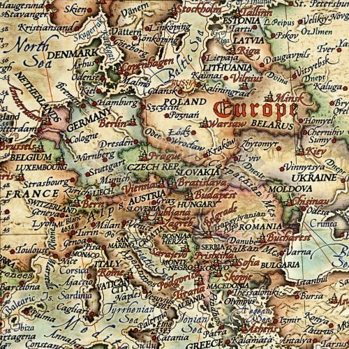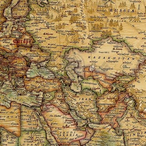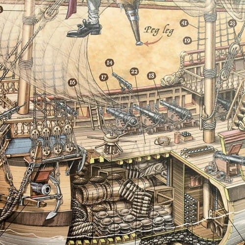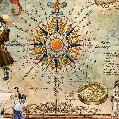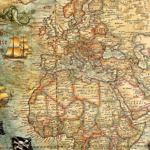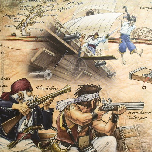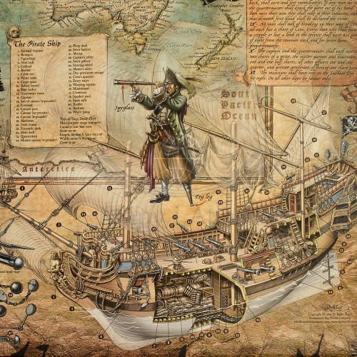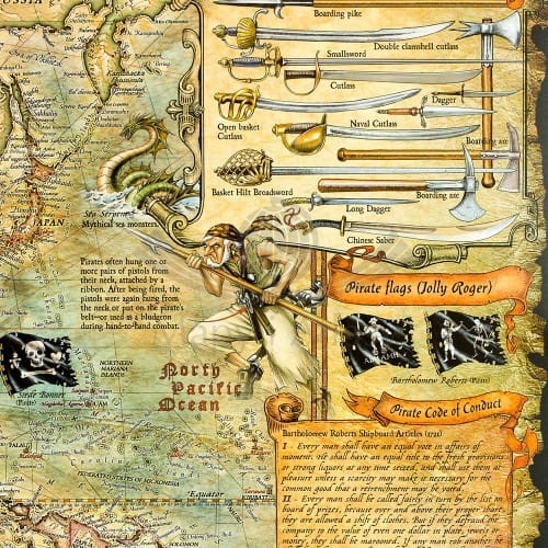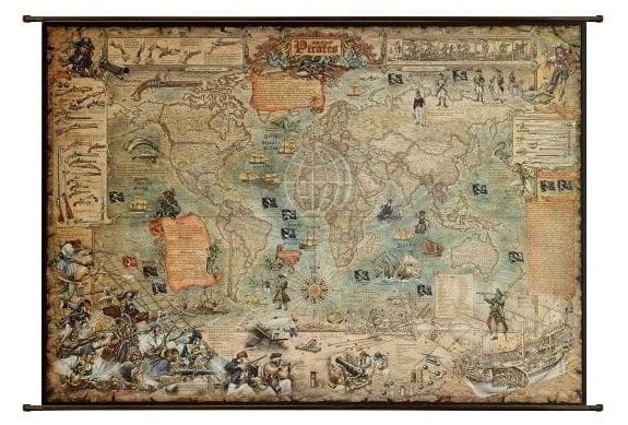 Stylizowana mapa Świata Piratów, wydawnictwa Ray & Co. Cechy mapy: aktualny podział polityczny świata, atrakcyjne ilustracje, eleganckie detale, stylowa kolorystyka, atrybuty pirackie i legendy...