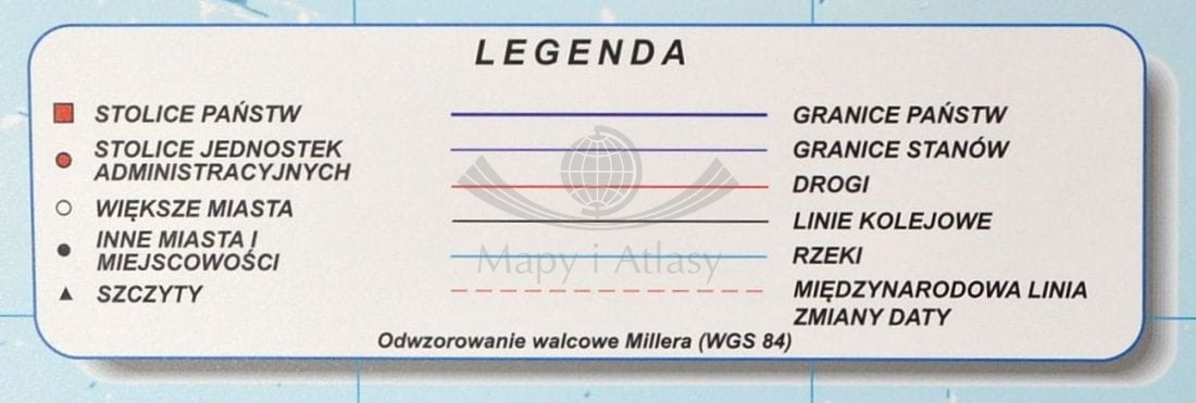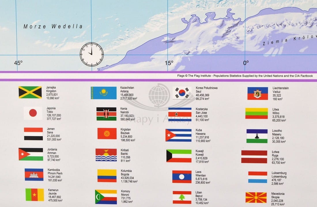 Bardzo duża mapa polityczna świata w języku polskim. Wzniesienia na lądach zaznaczone subtelnym cieniowaniem. Na mapie zobrazowano także ukształtowanie dna oceanów. U dołu mapy zamieszczono flagi państw oraz podstawowe informacje statystyczne.