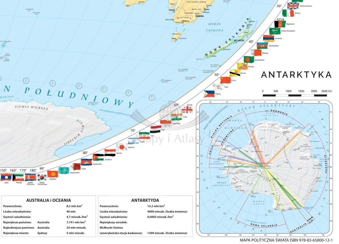 Szkolna, ścienna mapa polityczna świata w skali 1:22 000 000. Ukazuje sytuację polityczną świata, granice państw, granice sporne, a także granice stanów, prowincji i terytoriów. Mapa wzbogacona jest flagami państw oraz informacjami geograficzno-demograficznymi dla każdego kontynentu.