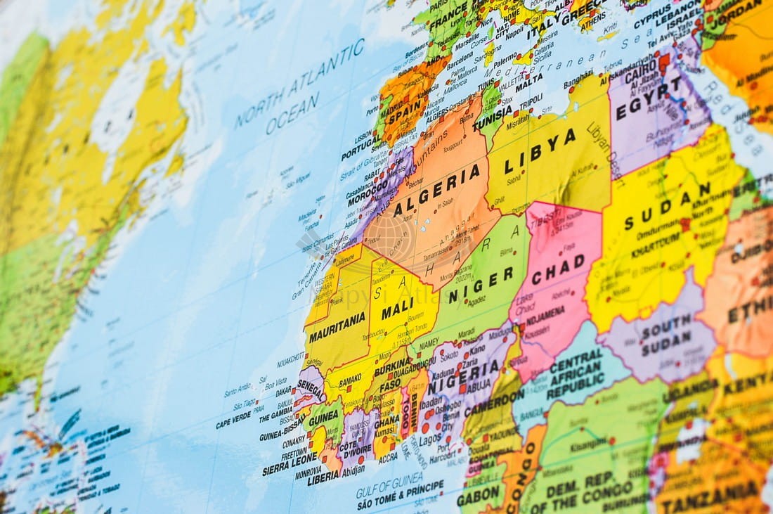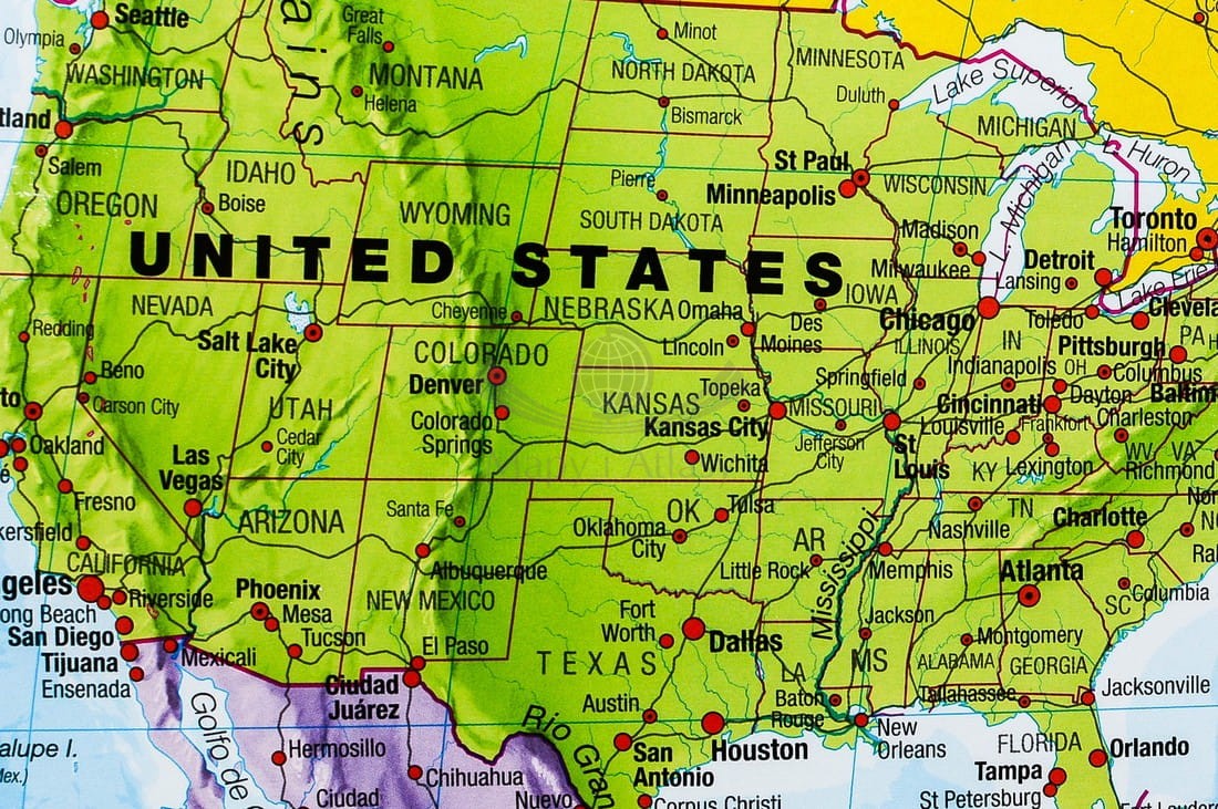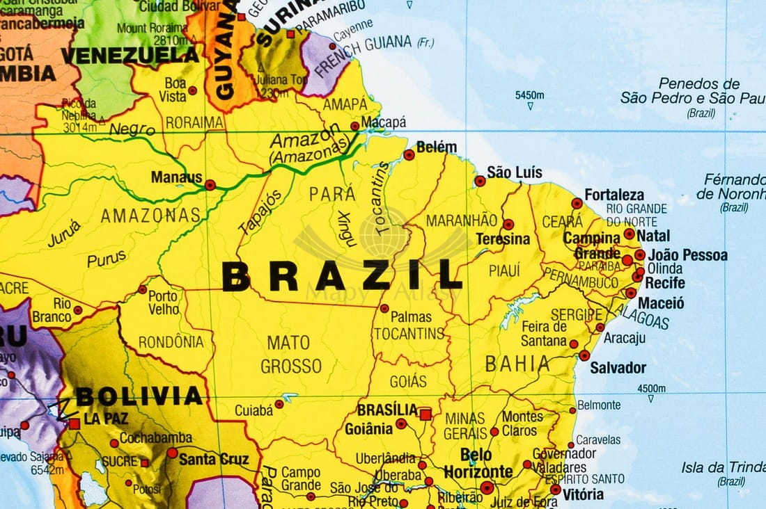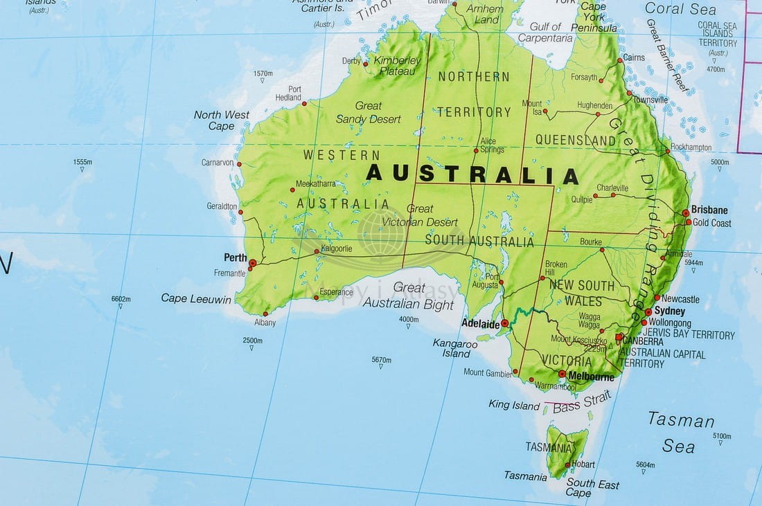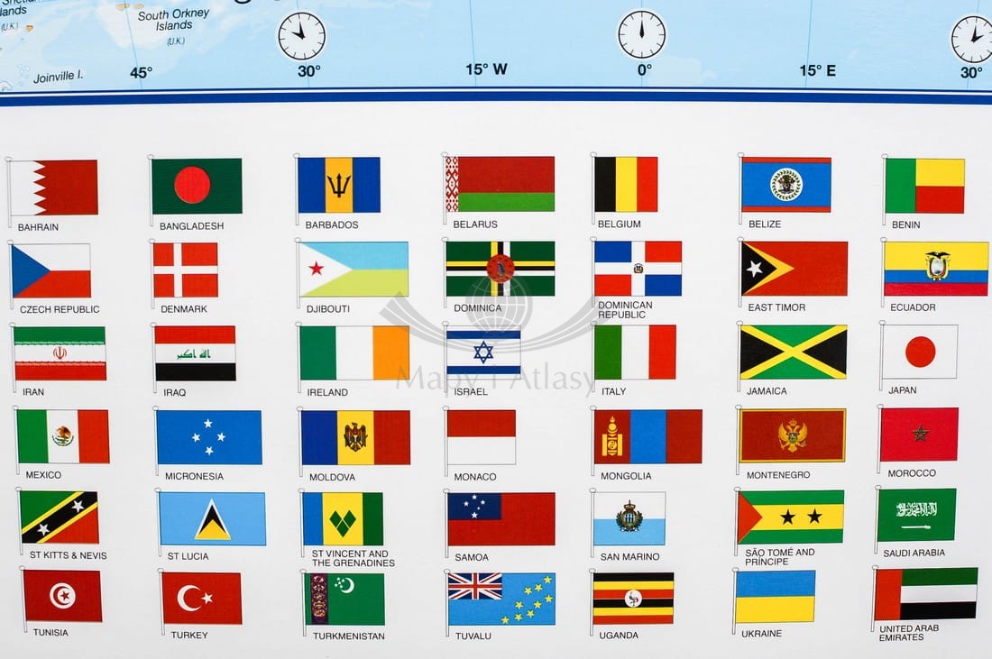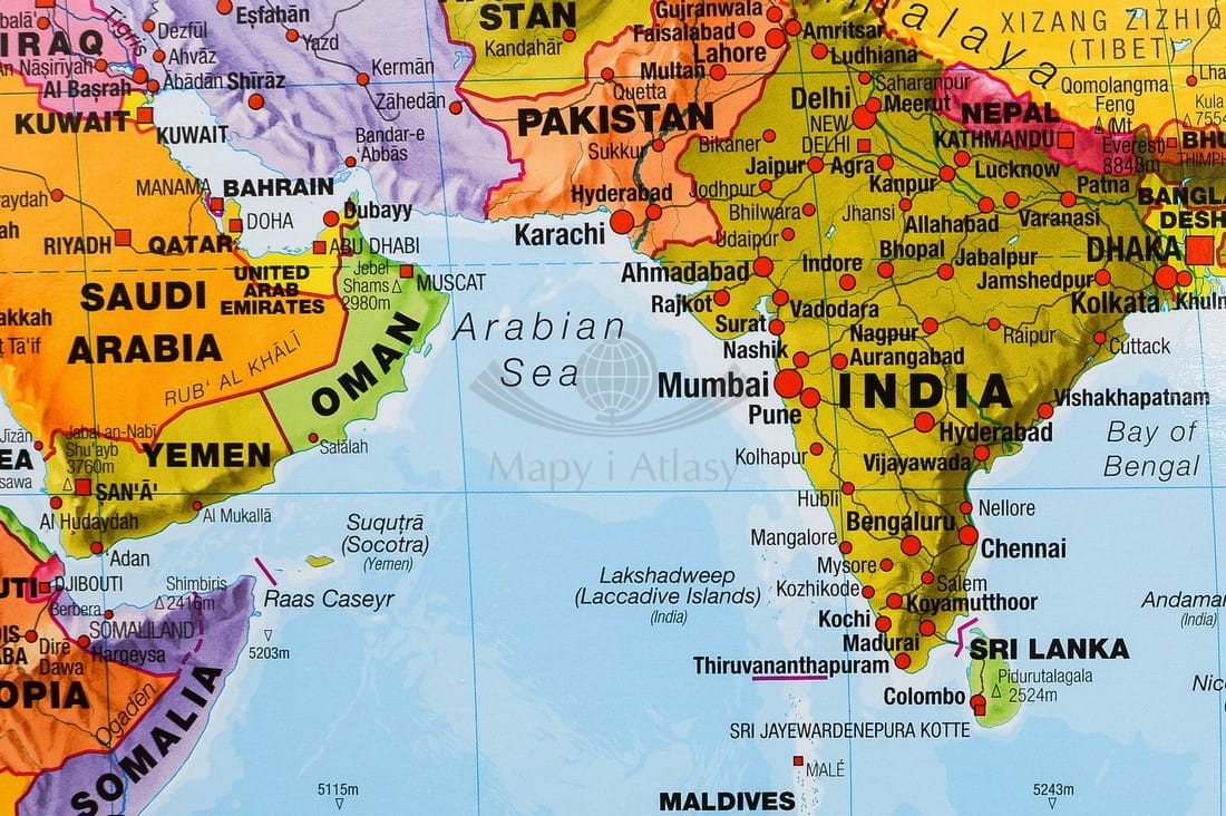 Doskonała, szczegółowa i aktualna mapa polityczna świata z podstawową siecią drogową. Cieniowaniem uwydatniono ukształtowanie powierzchni lądów, różnymi odcieniami koloru niebieskiego głębokość dna oceanów i mórz...