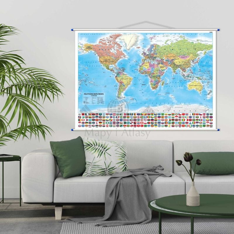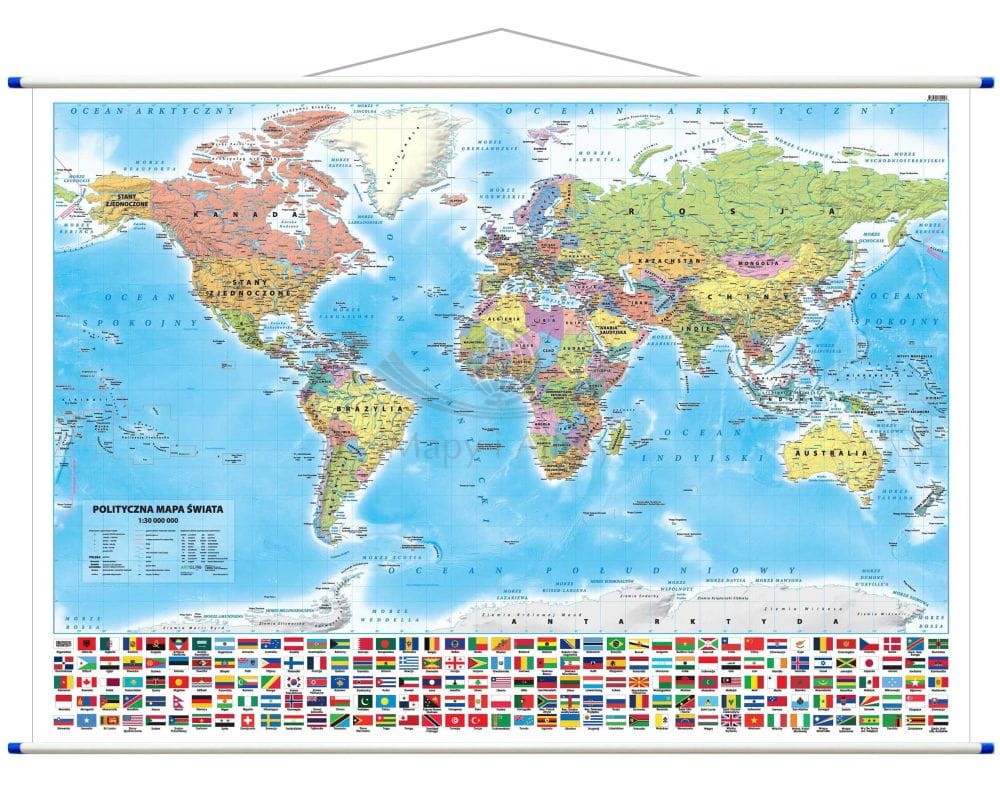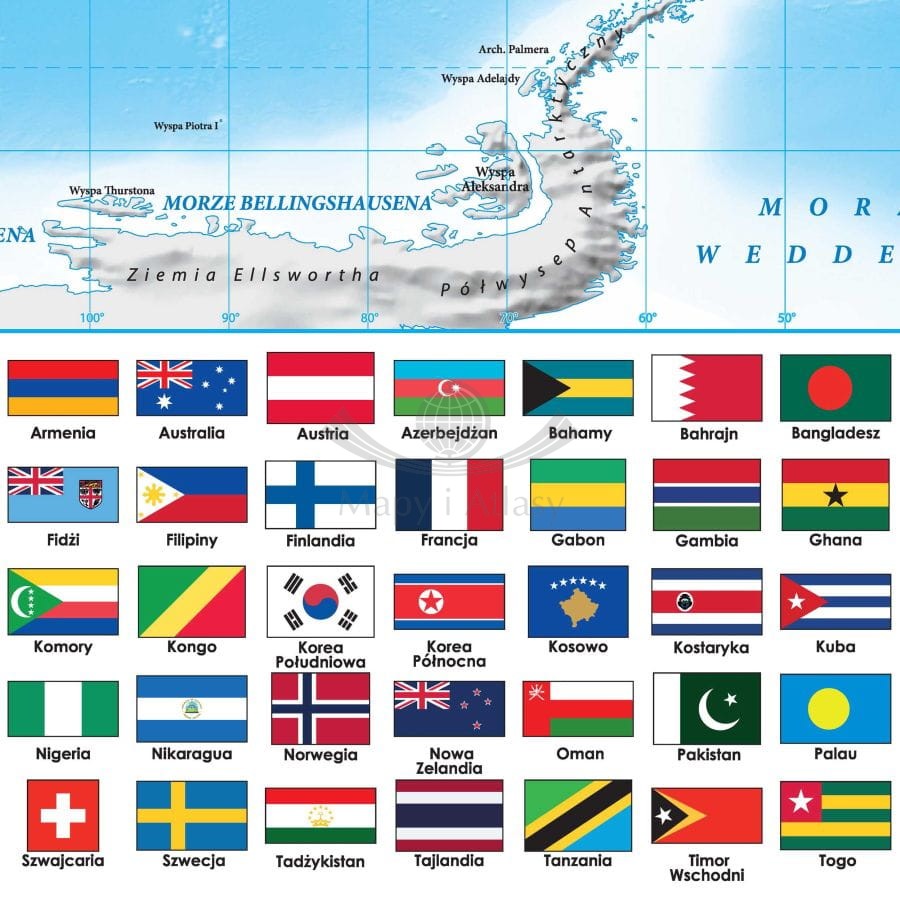 Na mapie wyraźnie zaznaczono informacje dotyczące podziału politycznego, a bogata, pastelowa kolorystyka ułatwia naukę i identyfikację poszczególnych państw. Dodatkowo w dolnej części mapy umieszczono flagi wszystkich państw świata, dzięki czemu stanowi ona bogate źródło wiedzy.