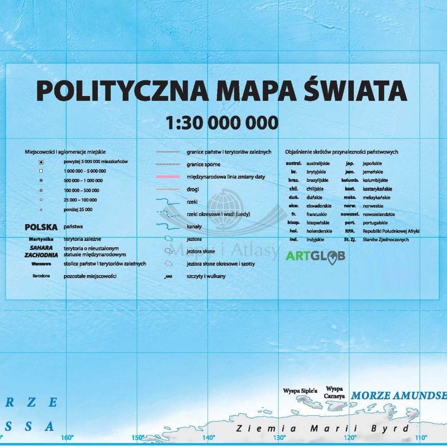 Dwustronna, polityczna i fizyczna mapa ścienna świata w skali 1:30 000 000 wydawnictwa ArtGlob.