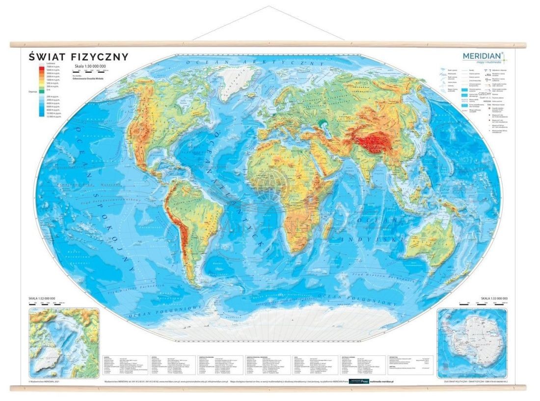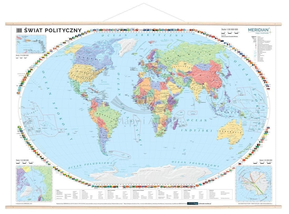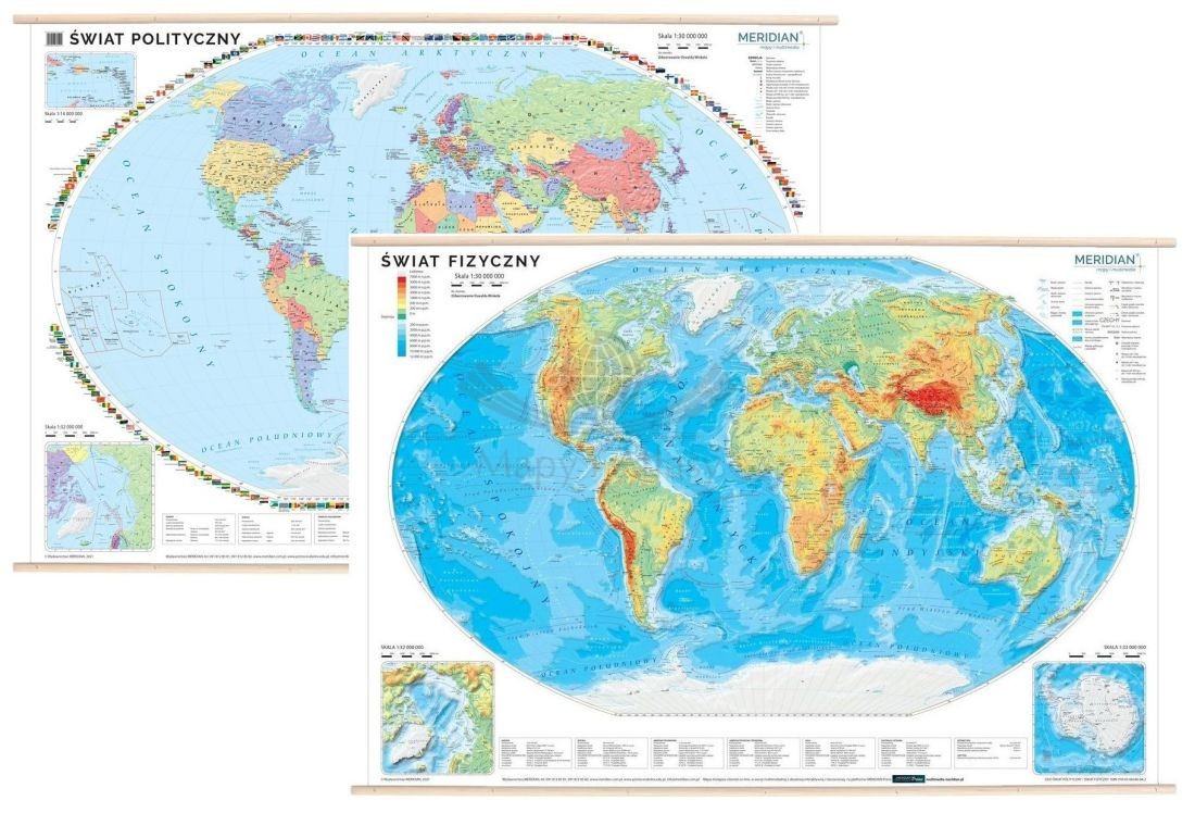 Świat 1:30 000 000. Dwustronna mapa ścienna. Polityczna / fizyczna z elementami ekologii. Drewniane półwałki