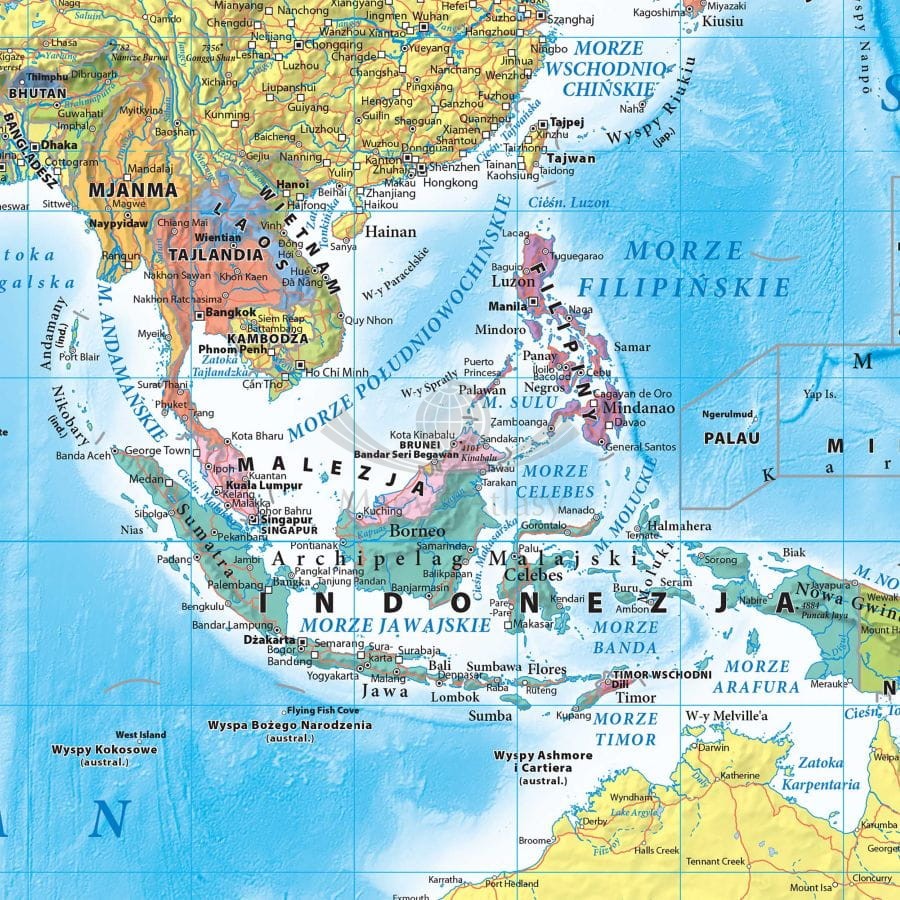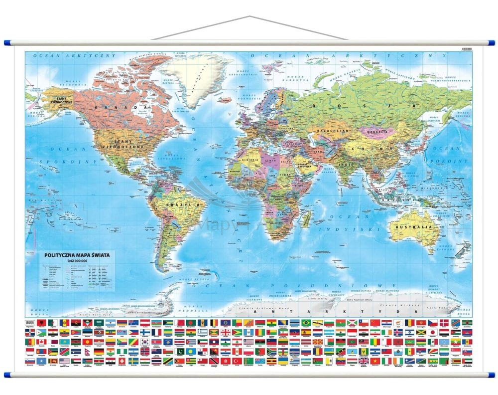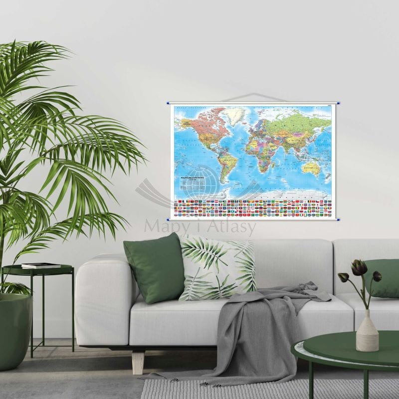 Na mapie wyraźnie zaznaczono informacje dotyczące podziału politycznego, a bogata, pastelowa kolorystyka ułatwia naukę i identyfikację poszczególnych państw. Dodatkowo w dolnej części mapy umieszczono flagi wszystkich państw świata, dzięki czemu stanowi ona bogate źródło wiedzy.