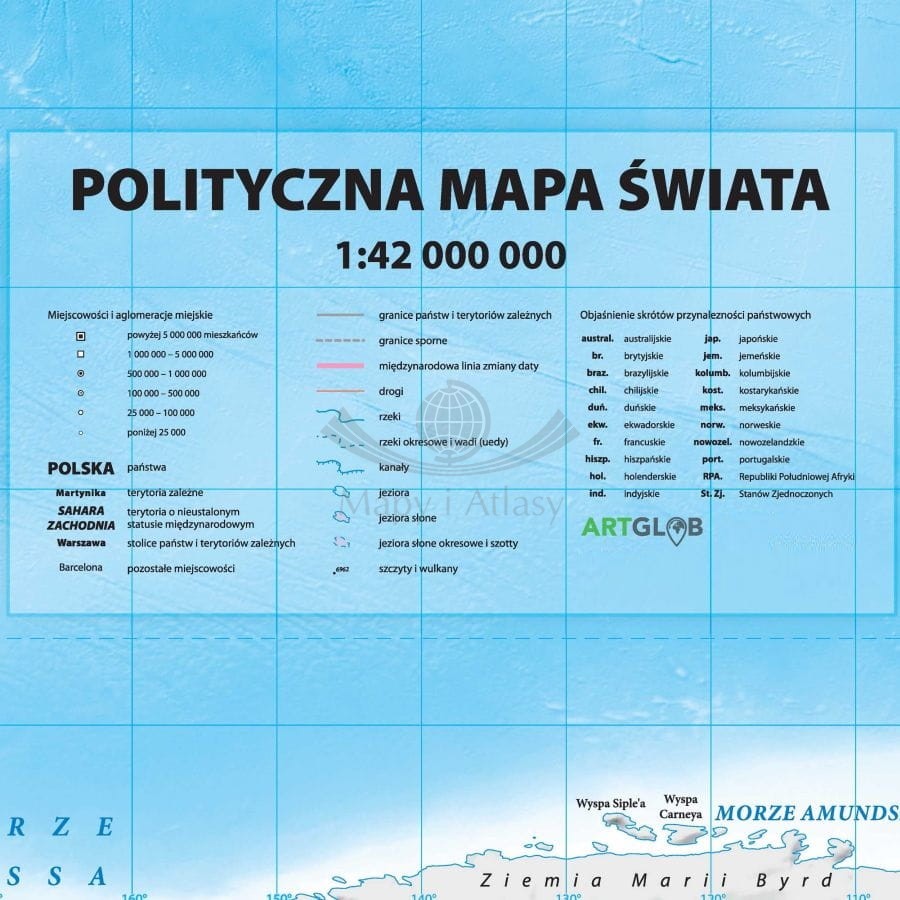 Dwustronna, polityczna i fizyczna mapa ścienna świata w skali 1:42 000 000 wydawnictwa ArtGlob.