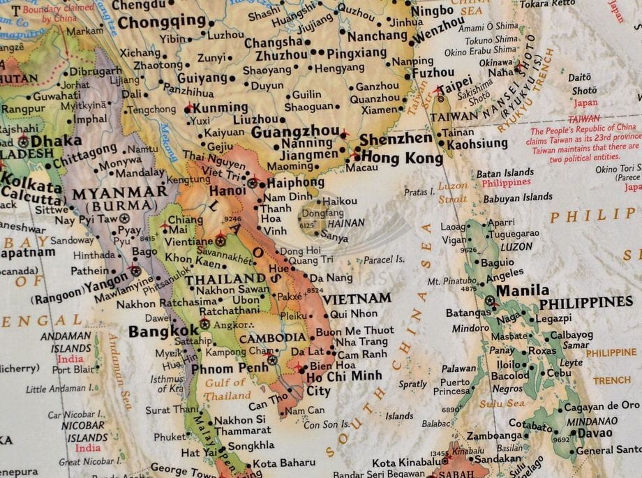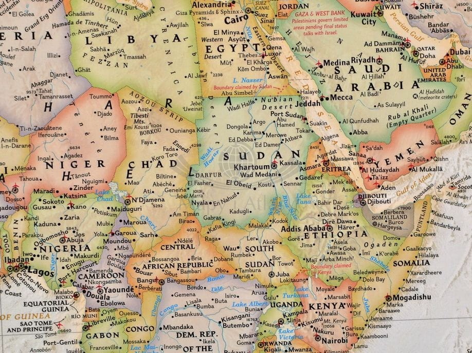 Mapa z elementami mapy fizycznej, drogowej i administracyjnej. Stylizacja charakterystyczna dla National Geographic.