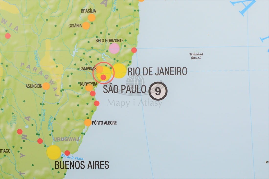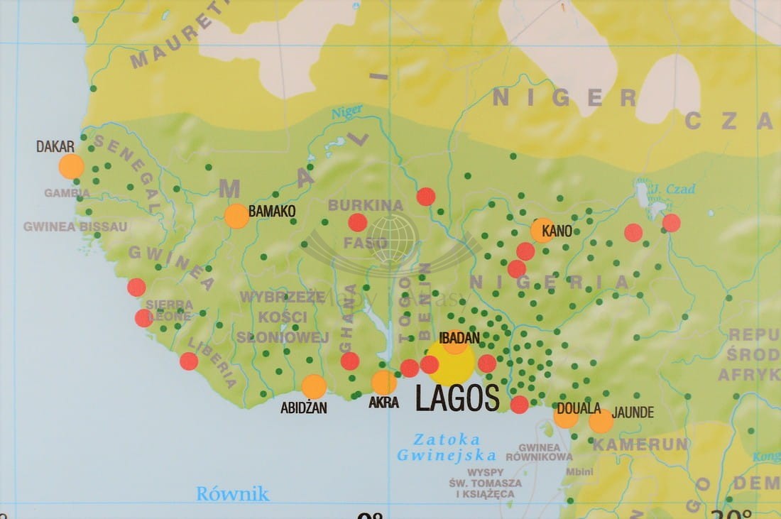 Szkolna mapa ścienna w skali 1:22 000 000 przedstawiająca rozmieszczenie ludności na świecie, istotne zagadnienie z dziedziny geografii jaką jest demografia. Na tle stref ekumeny, subekumeny i anekumeny pokazane jest umiejscowienie skupisk ludności powyżej 100 000 mieszkańców oraz najważniejsze aglomeracje naszego globu. Pod mapą wypisane jest 10 największych aglomeracji świata.