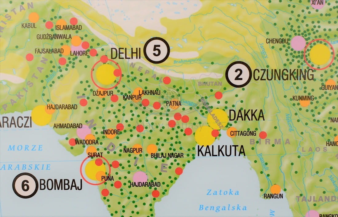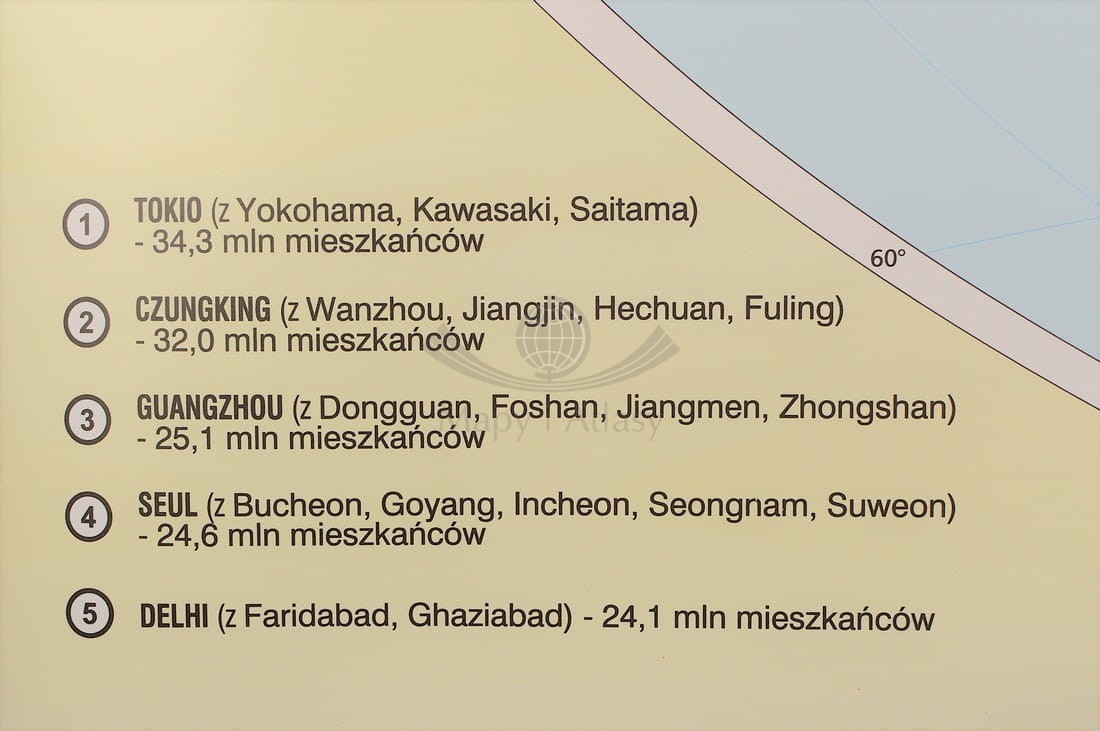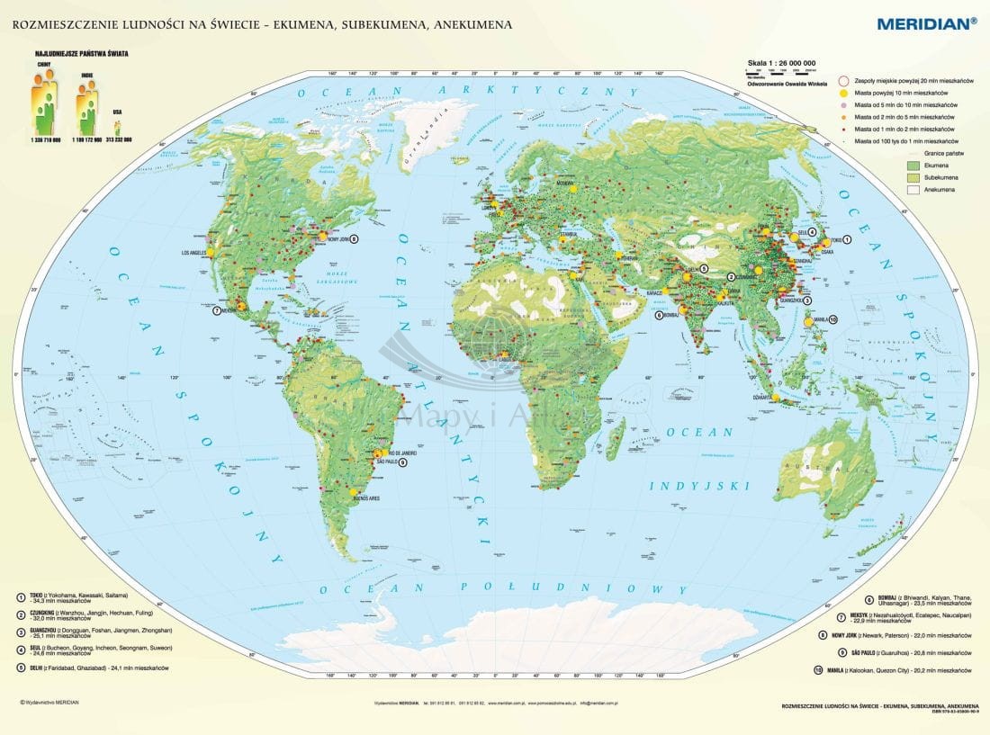 Szkolna mapa ścienna w skali 1:26 000 000 przedstawiająca rozmieszczenie ludności na świecie, istotne zagadnienie z dziedziny geografii jaką jest demografia. Na tle stref ekumeny, subekumeny i anekumeny pokazane jest umiejscowienie skupisk ludności powyżej 100 000 mieszkańców oraz najważniejsze aglomeracje naszego globu. Pod mapą wypisane jest 10 największych aglomeracji świata.