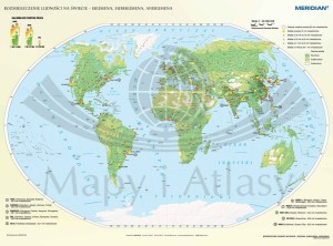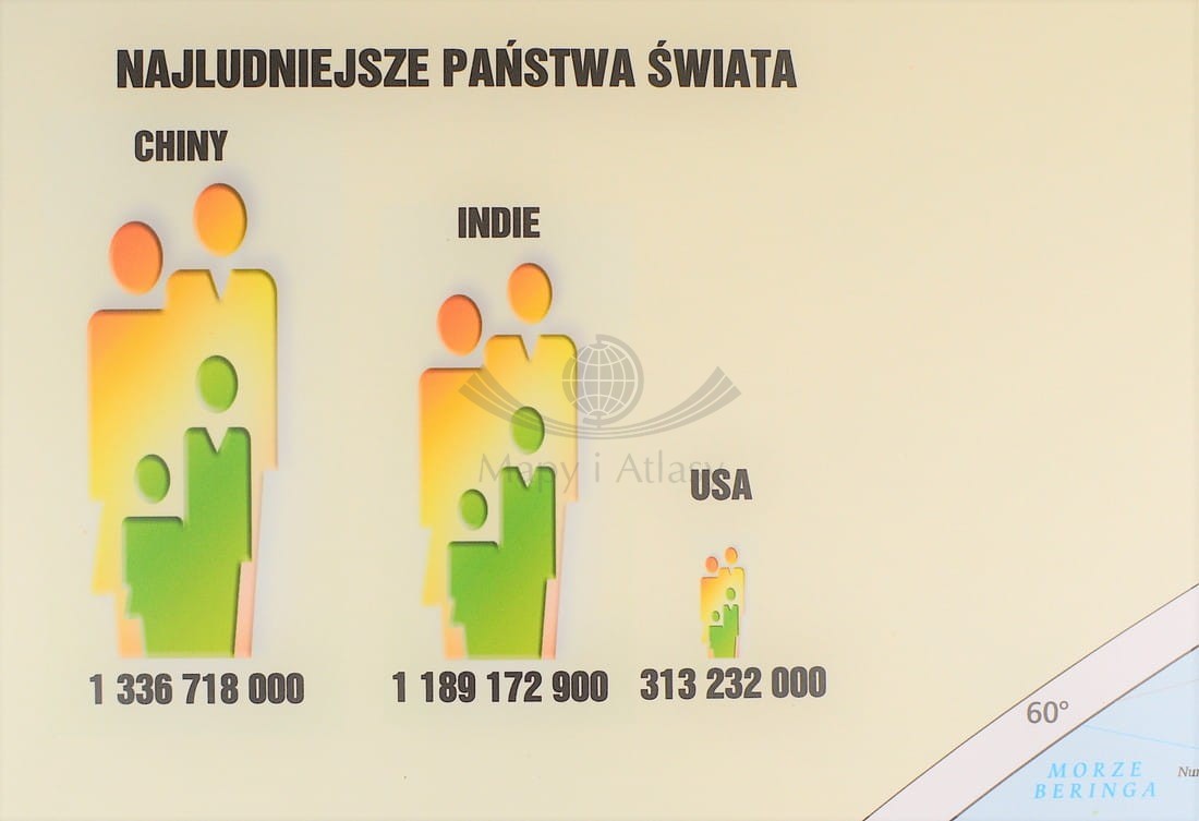 Szkolna mapa ścienna w skali 1:26 000 000 przedstawiająca rozmieszczenie ludności na świecie, istotne zagadnienie z dziedziny geografii jaką jest demografia. Na tle stref ekumeny, subekumeny i anekumeny pokazane jest umiejscowienie skupisk ludności...