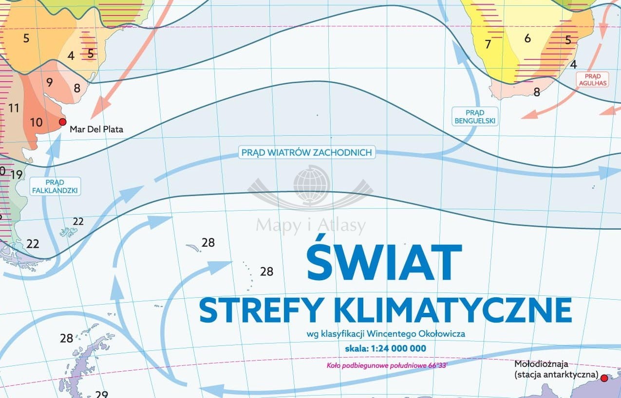 Szkolna mapa ścienna przedstawiająca strefy klimatyczne na świecie wg klasyfikacji Wincentego Okołowicza.