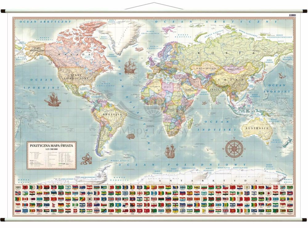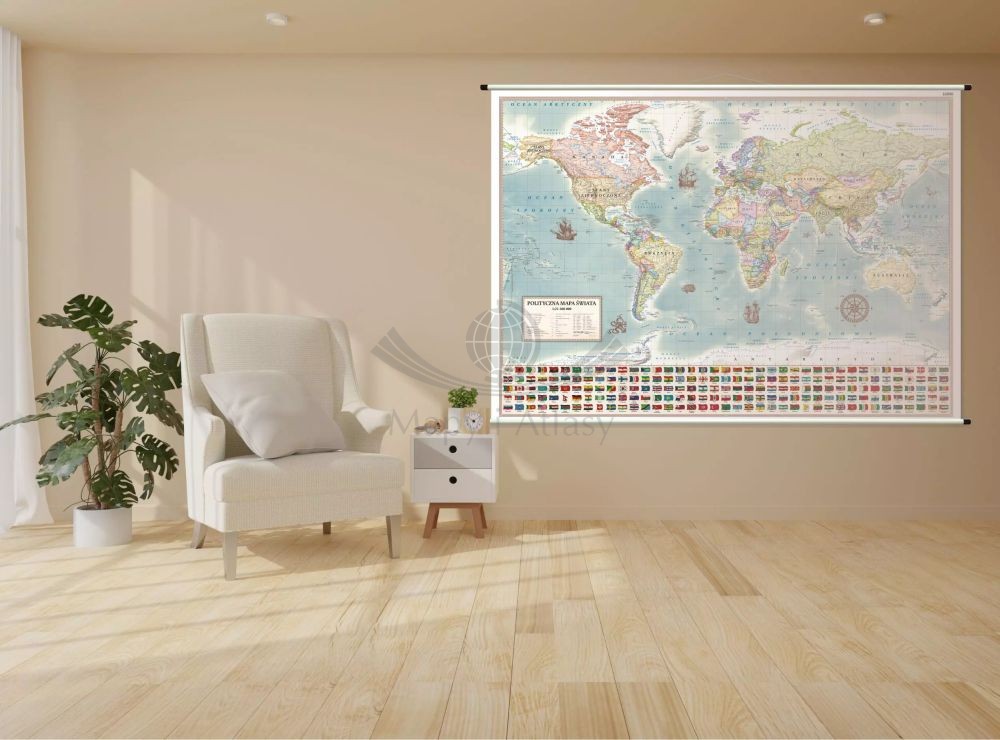 Dodatkowo w dolnej części mapy umieszczono flagi wszystkich państw świata, dzięki czemu stanowi ona bogate źródło wiedzy.
