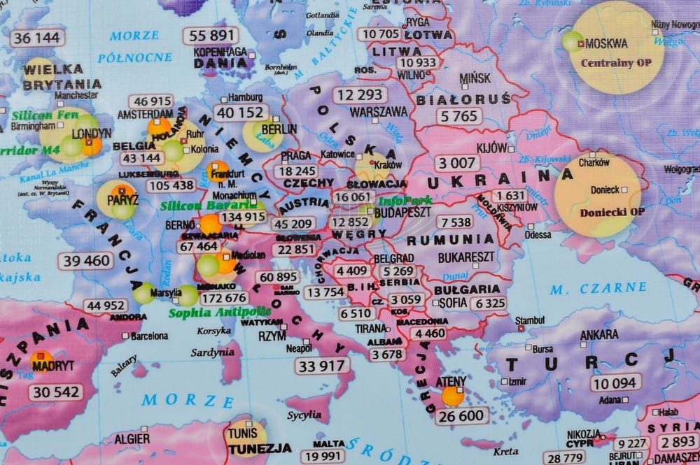 Pierwsza część poświęcona jest nowoczesnemu ujęciu zagadnień gospodarczych i bazuje na kartogramie prezentującym wartości PKB w USD/1 mieszkańca. Dodatkowo dla każdego państwa opisana jest dokładna wartość tego wskaźnika. Na tle kartogramu ukazane jest rozmieszczenie najważniejszych okręgów przemysłowych, technopolii oraz giełd papierów wartościowych.